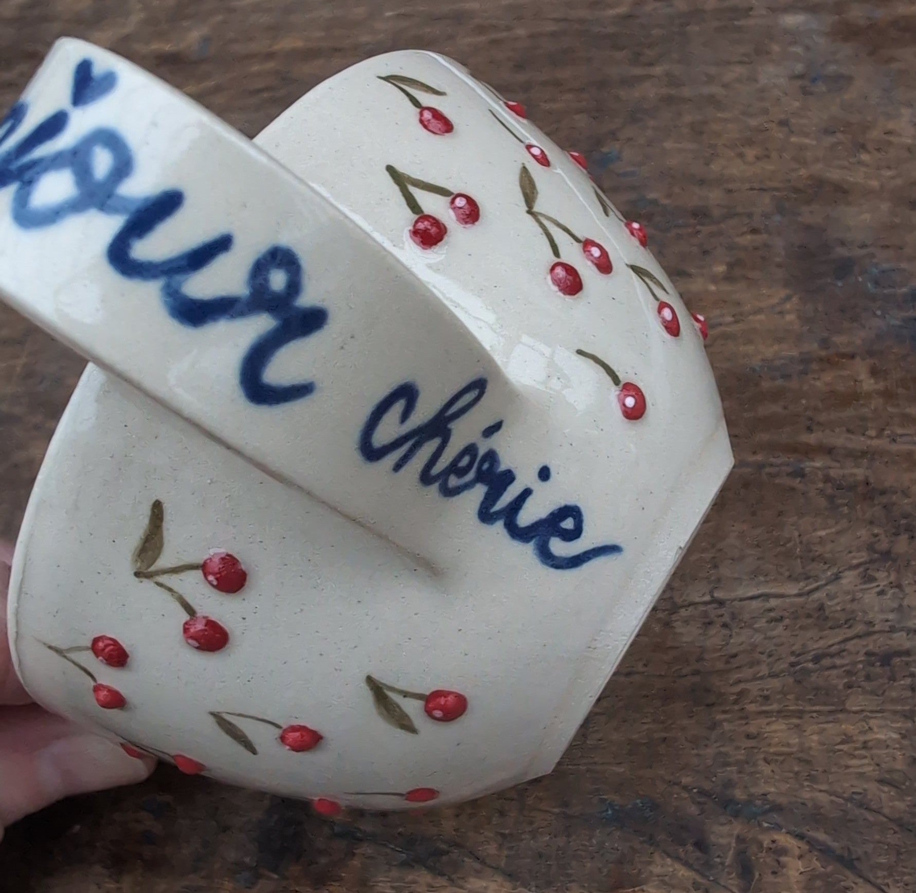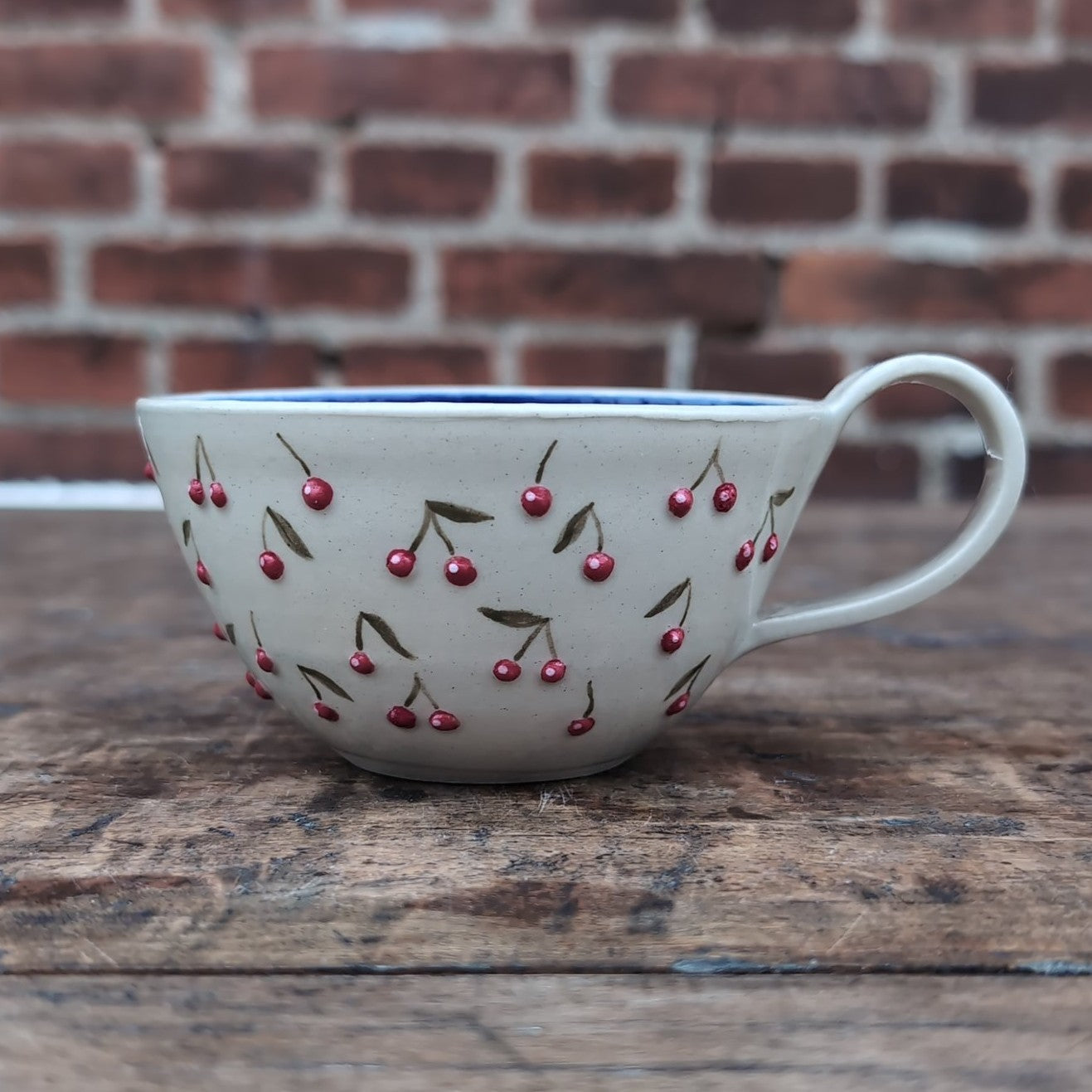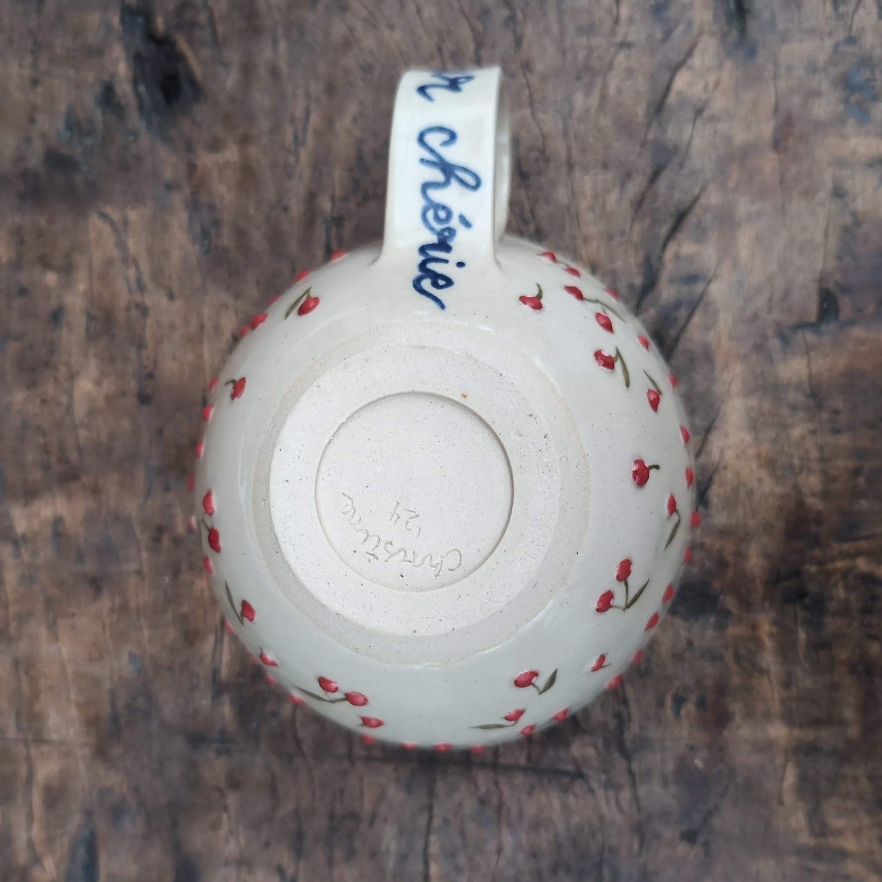 En kop der med garanti giver et smil på læben. Ydersiden er dekoreret med små kirsebær, der ét efter ét er formet, og påsat i relief. Derefter er de mere end 50 kirsebær håndmalet enkeltvis, så de små buttede bær stikker ud fra koppen. Indersiden står i kontrast med smuk kobolt blå. Prikken over i´et er teksten "Bonjour chérie" på hanken.