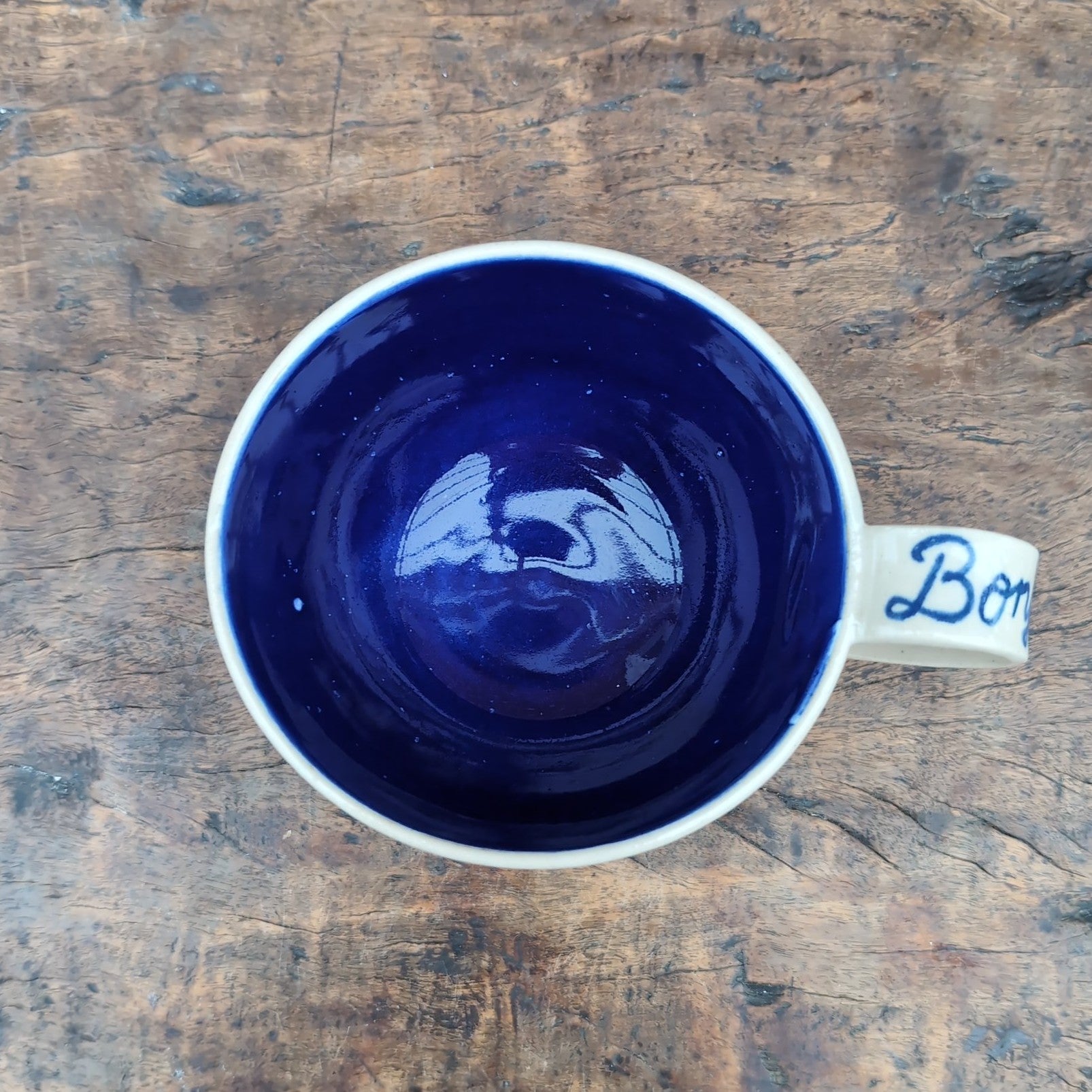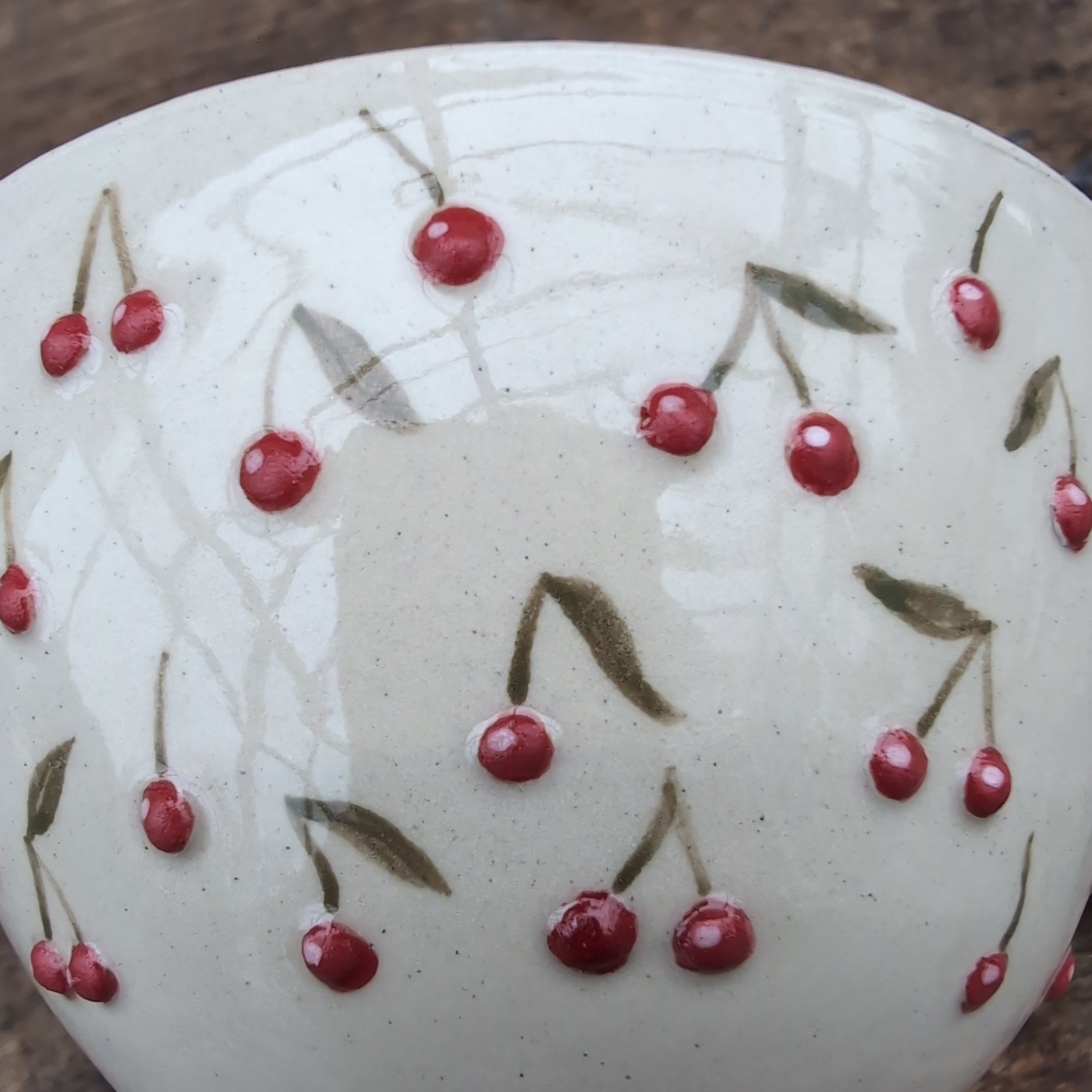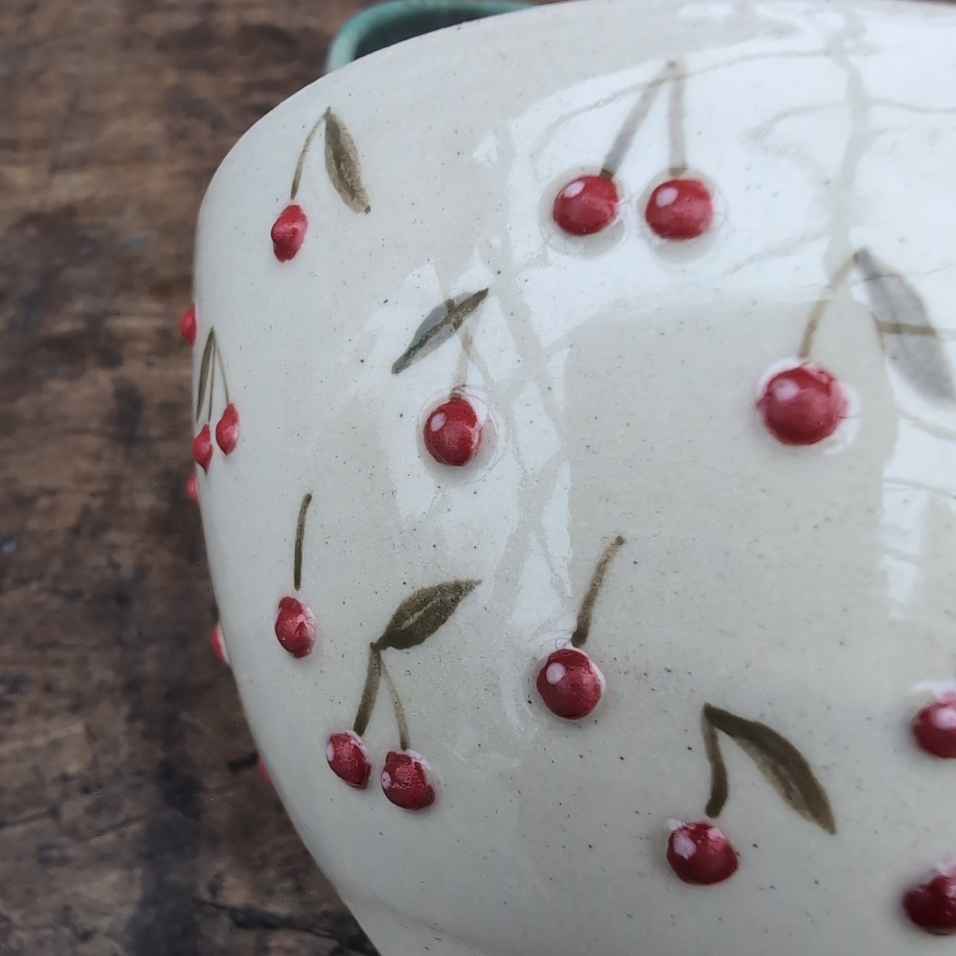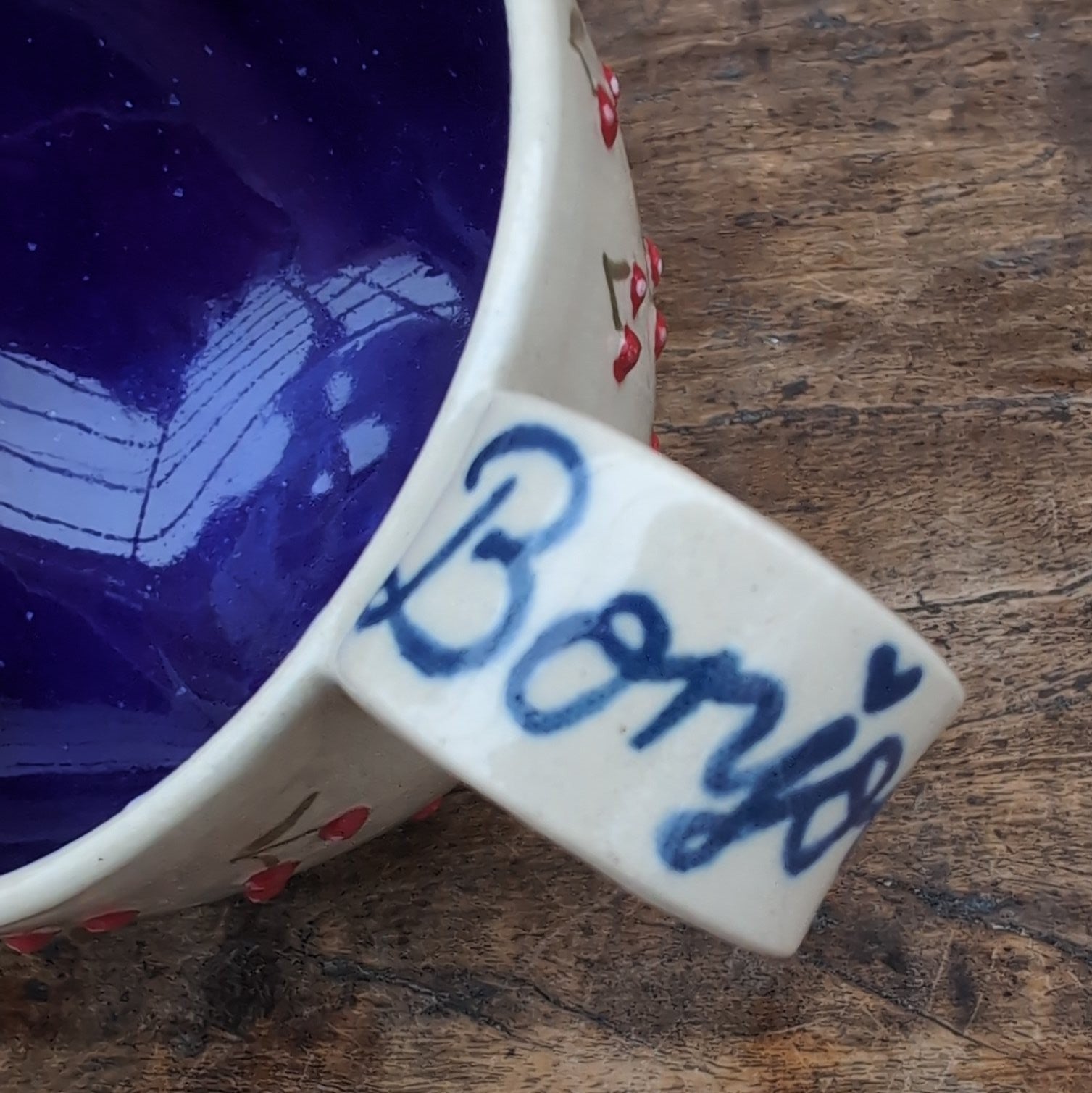 En kop der med garanti giver et smil på læben. Ydersiden er dekoreret med små kirsebær, der ét efter ét er formet, og påsat i relief. Derefter er de mere end 50 kirsebær håndmalet enkeltvis, så de små buttede bær stikker ud fra koppen. Indersiden står i kontrast med smuk kobolt blå. Prikken over i´et er teksten "Bonjour chérie" på hanken.