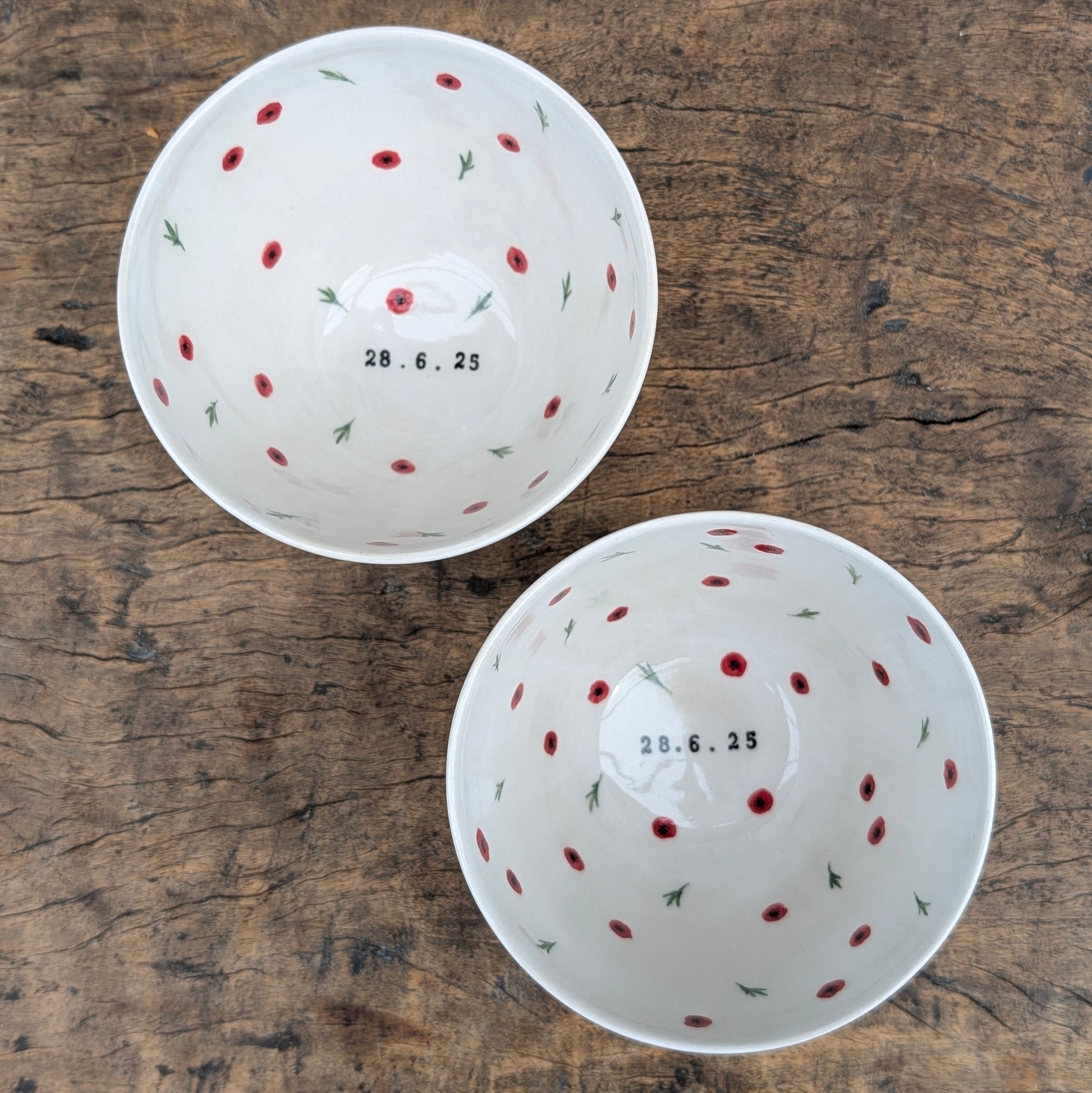 Da kopperne skal glaseres og brændes efter jeg har malet tekst og motiver på, kan der være en leveringstid på 3 uger.