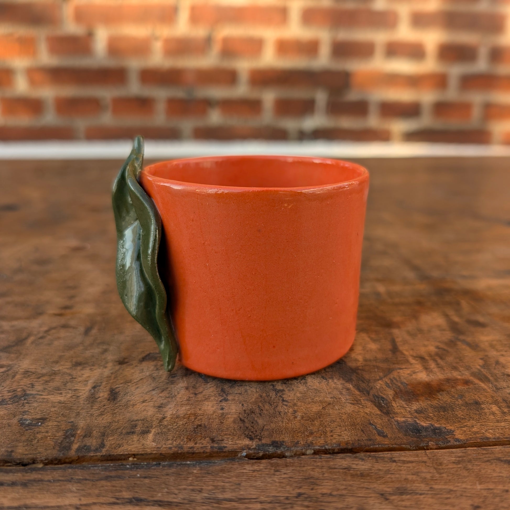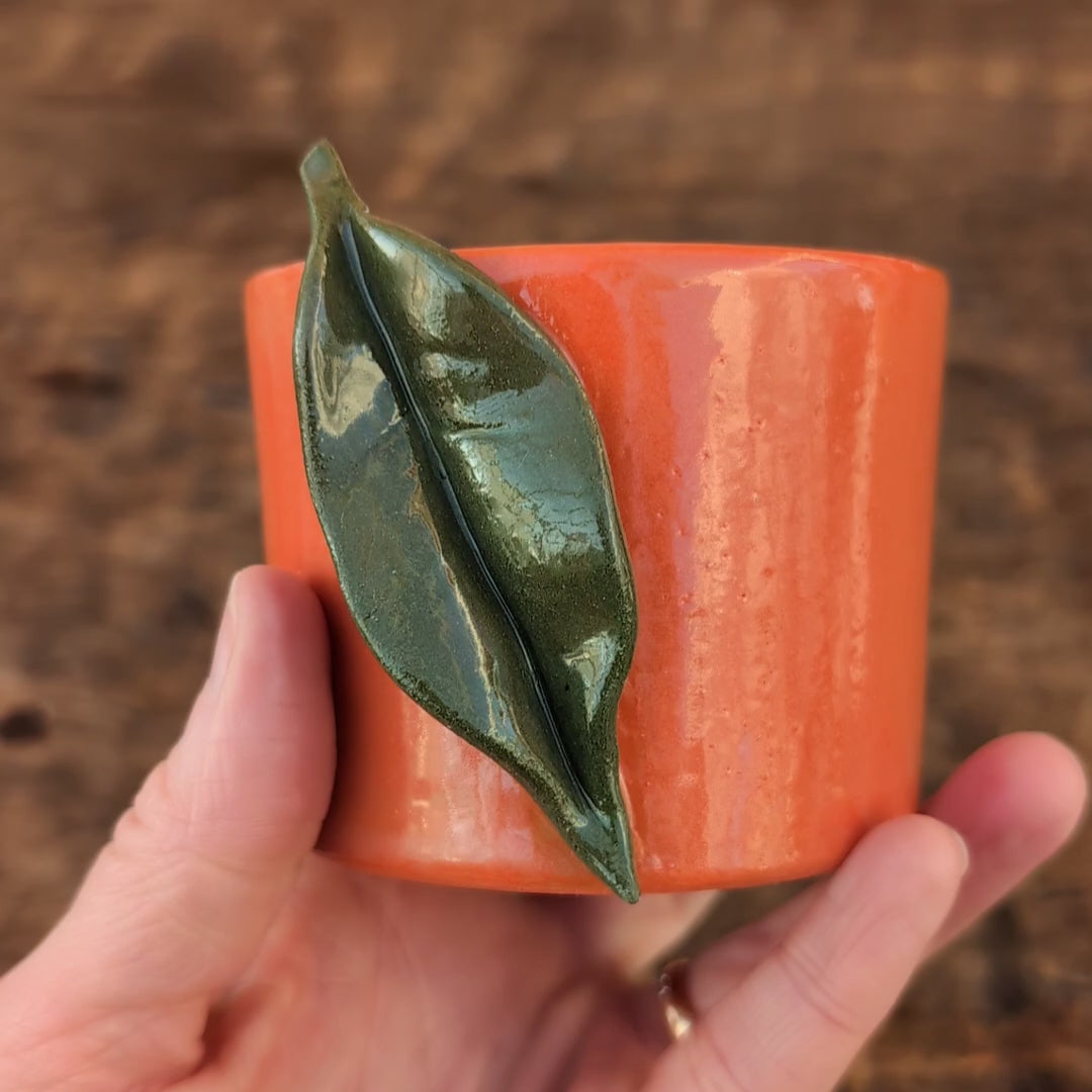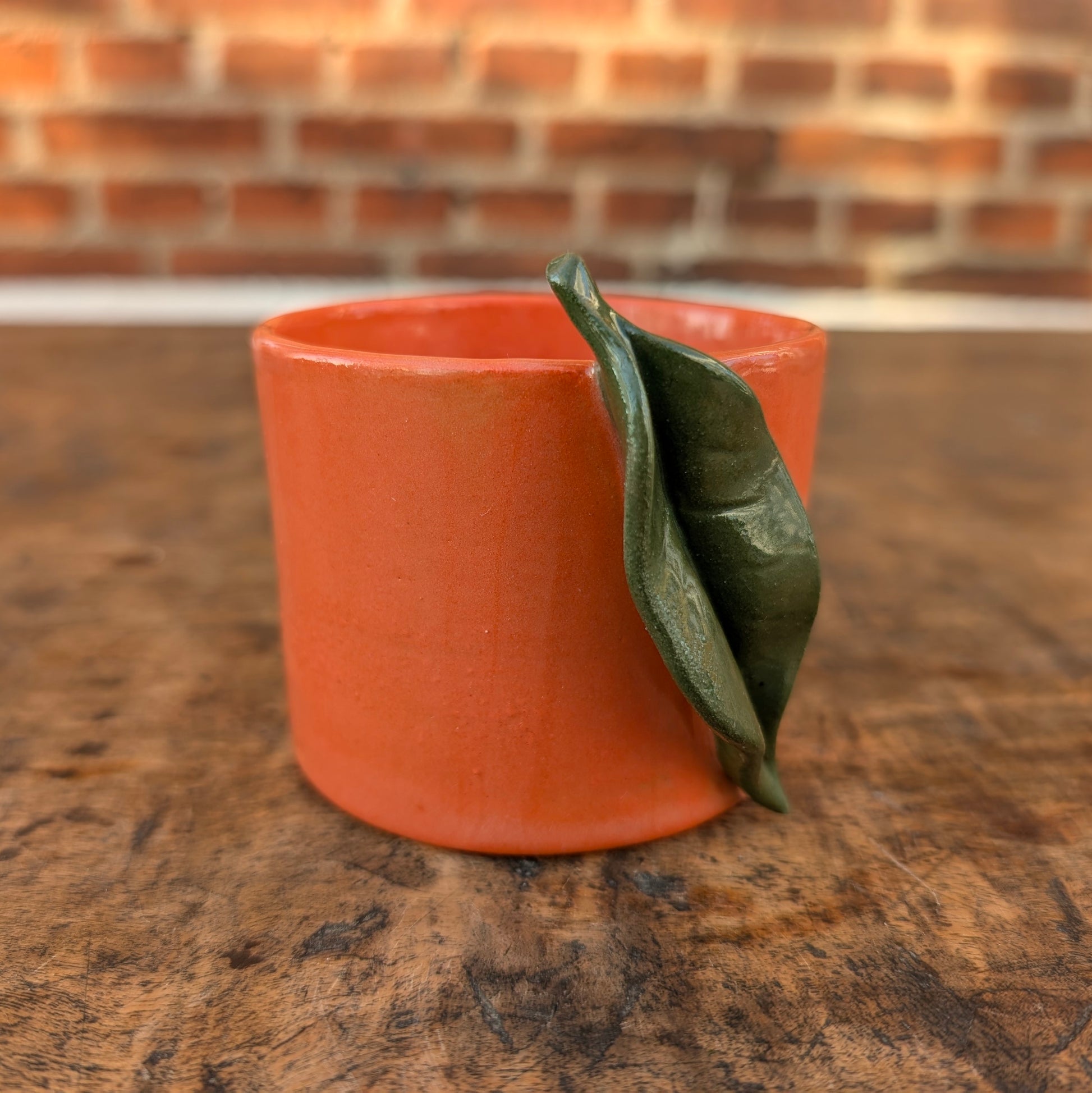 Lækker orange kop dekoreret som er appelsin med grønt håndlavet blad monteret på siden.