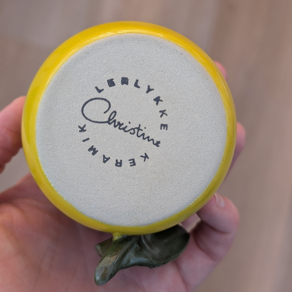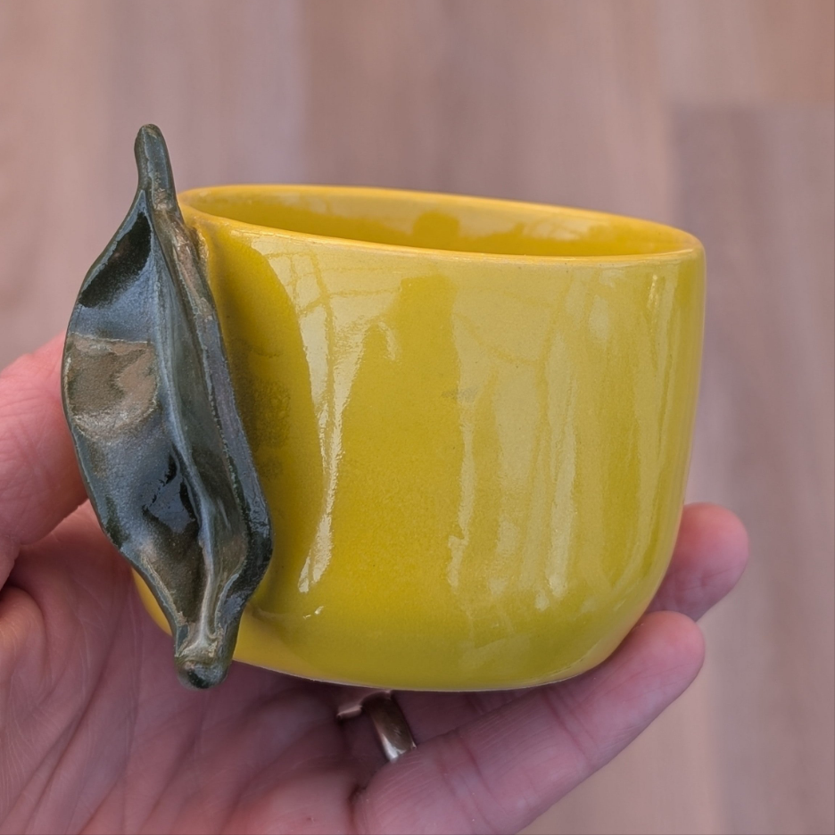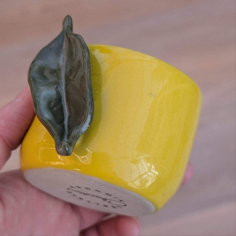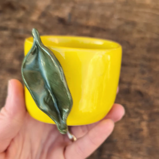 Lækker gul cortado kop med organisk form, dekoreret som er citron med grønt håndlavet blad monteret på siden.