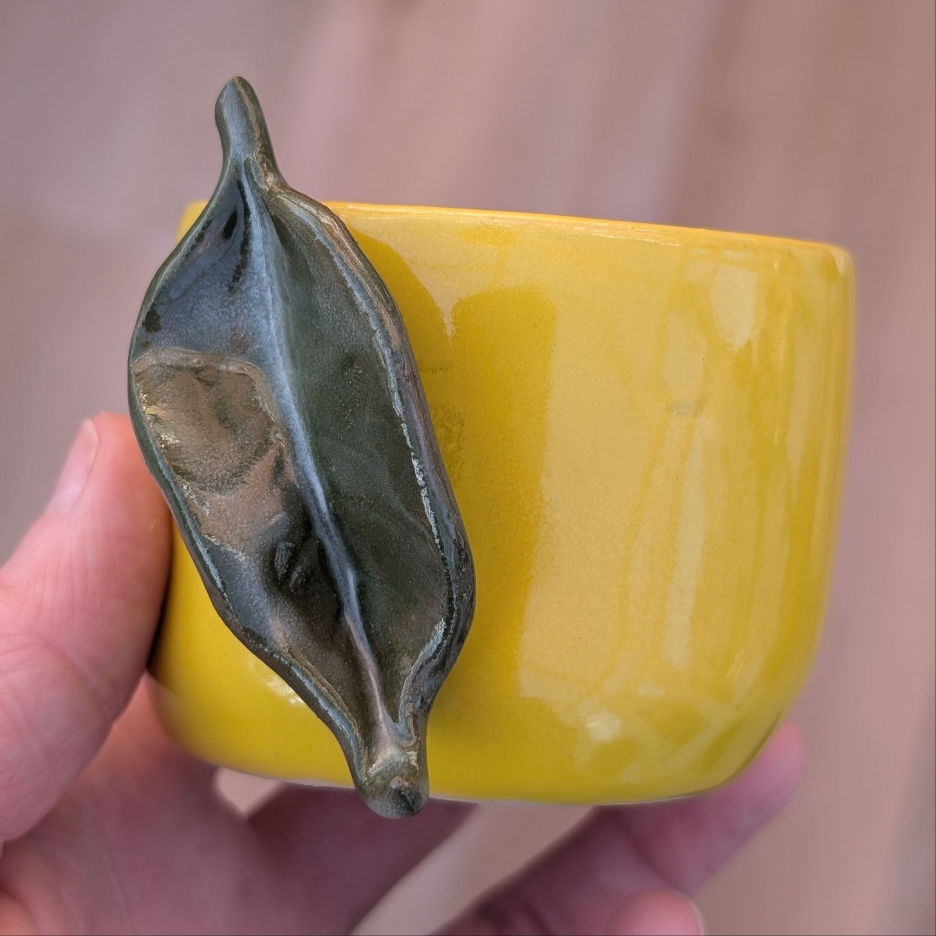 Finish: Gul blank glasur på kop, grøn blank glasur på blad