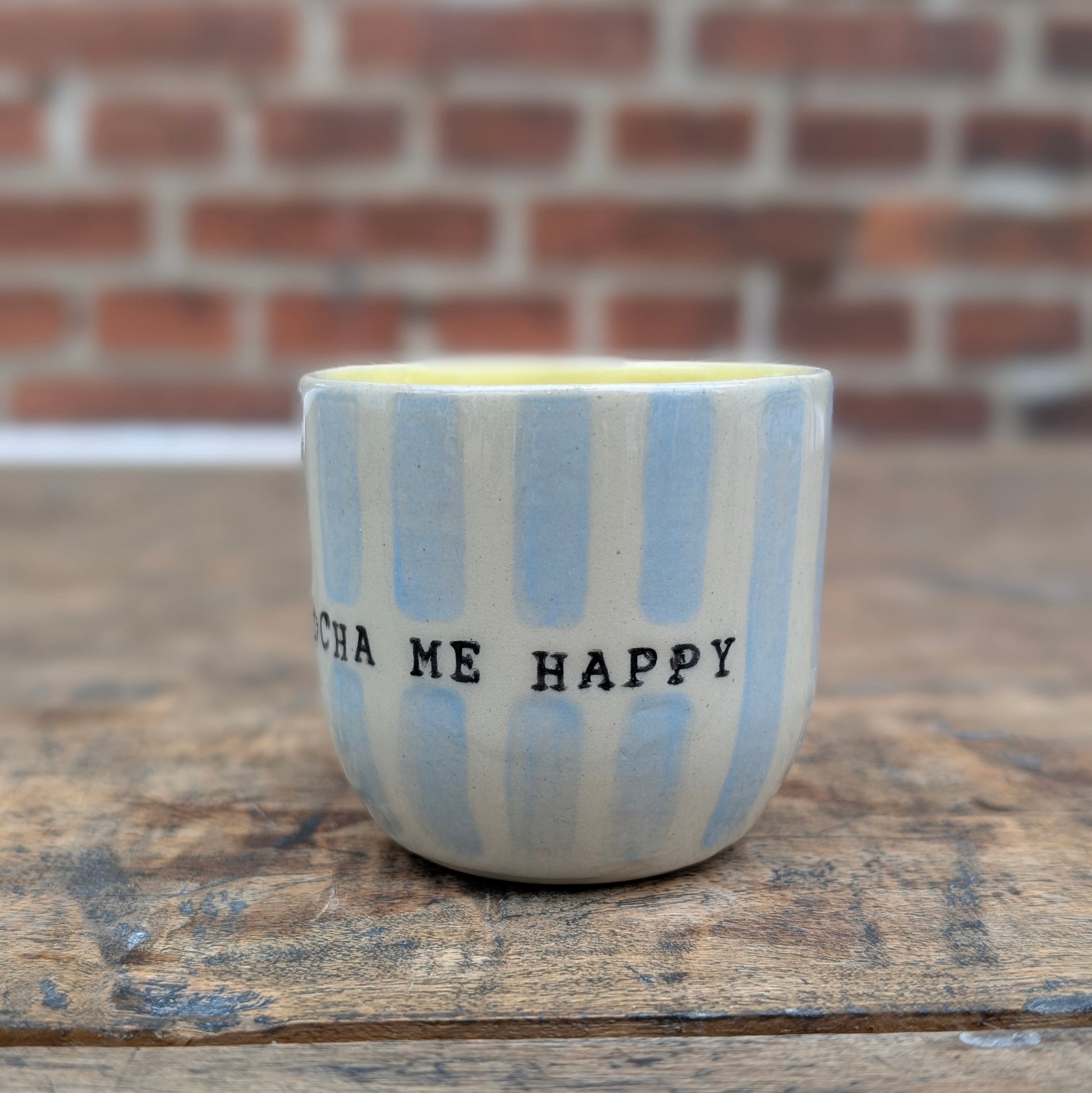 Skøn kop der passer perfekt til en cortado, men selvfølgelig også fint til en espresso. Dejlig sommer følelse, med den gule midte og blå striber. Vælg mellem "Min", "Pause", "Ciao Bella" eller "You mocha me happy".