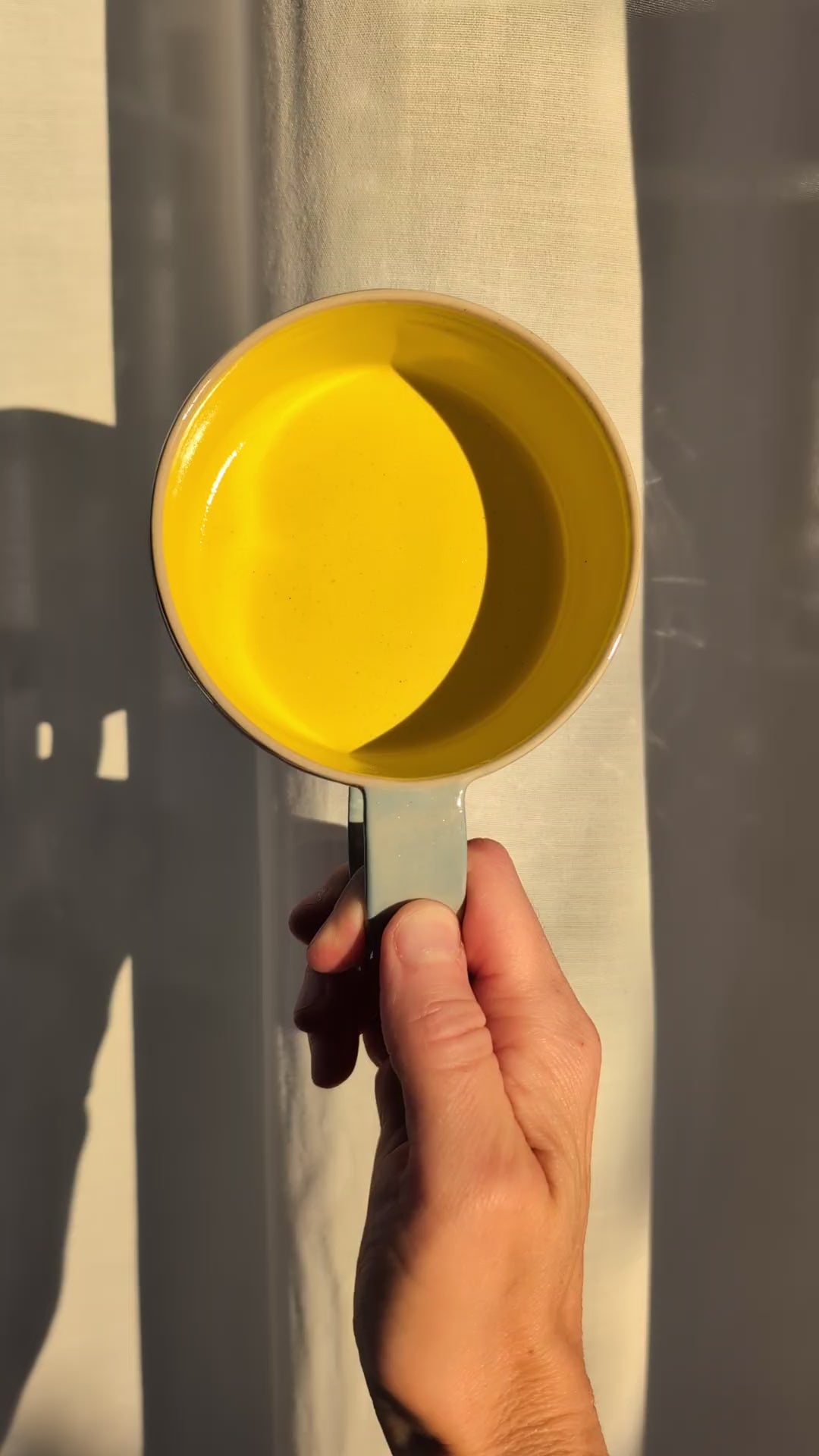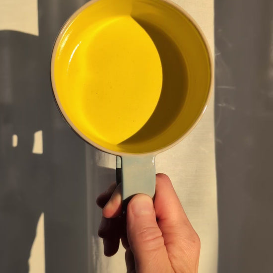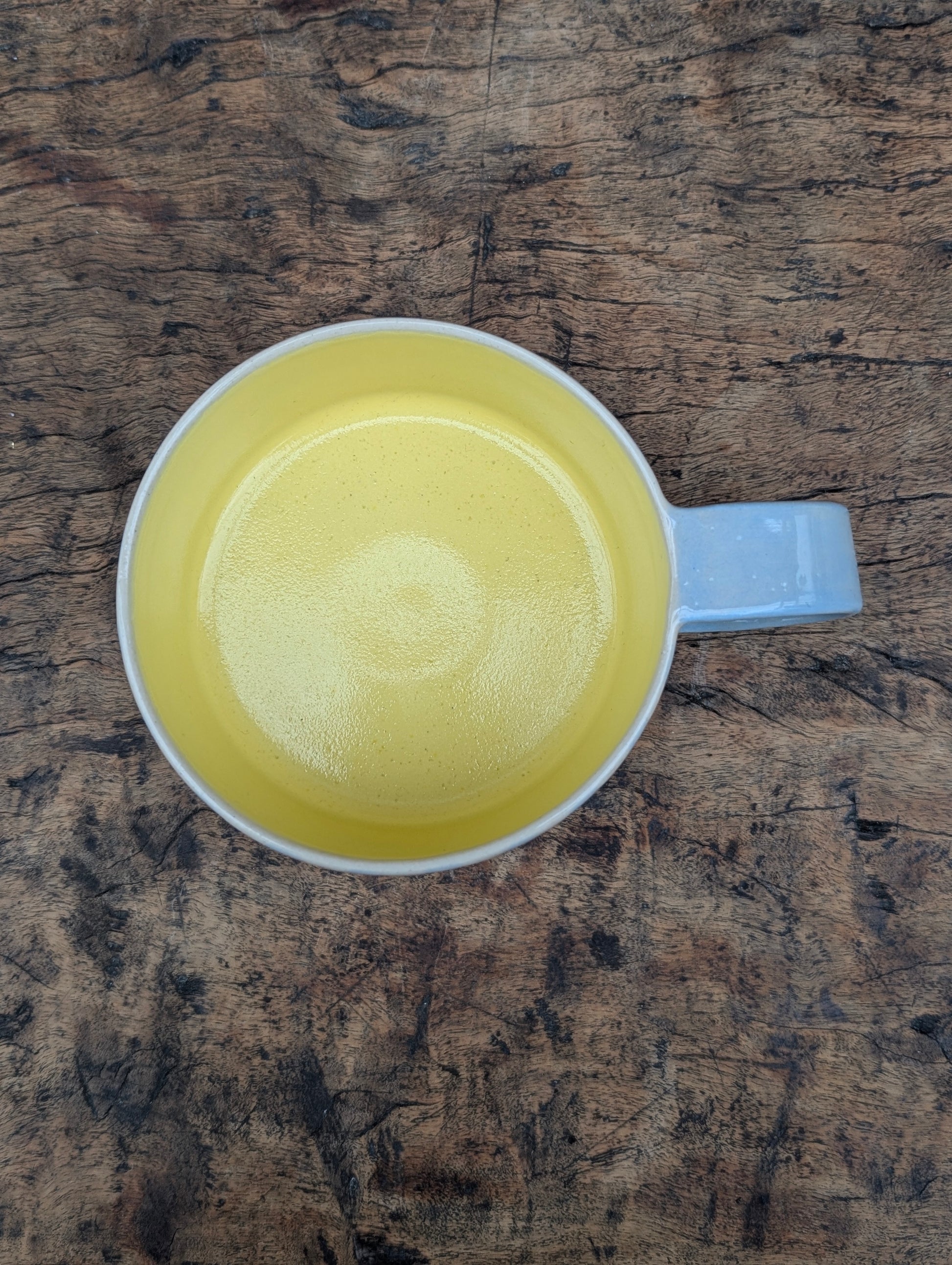 Skøn kop der passer perfekt til en stor kop kaffe, te eller kakako. En kop man bliver i godt humør af, med den gule midte og blå striber.
