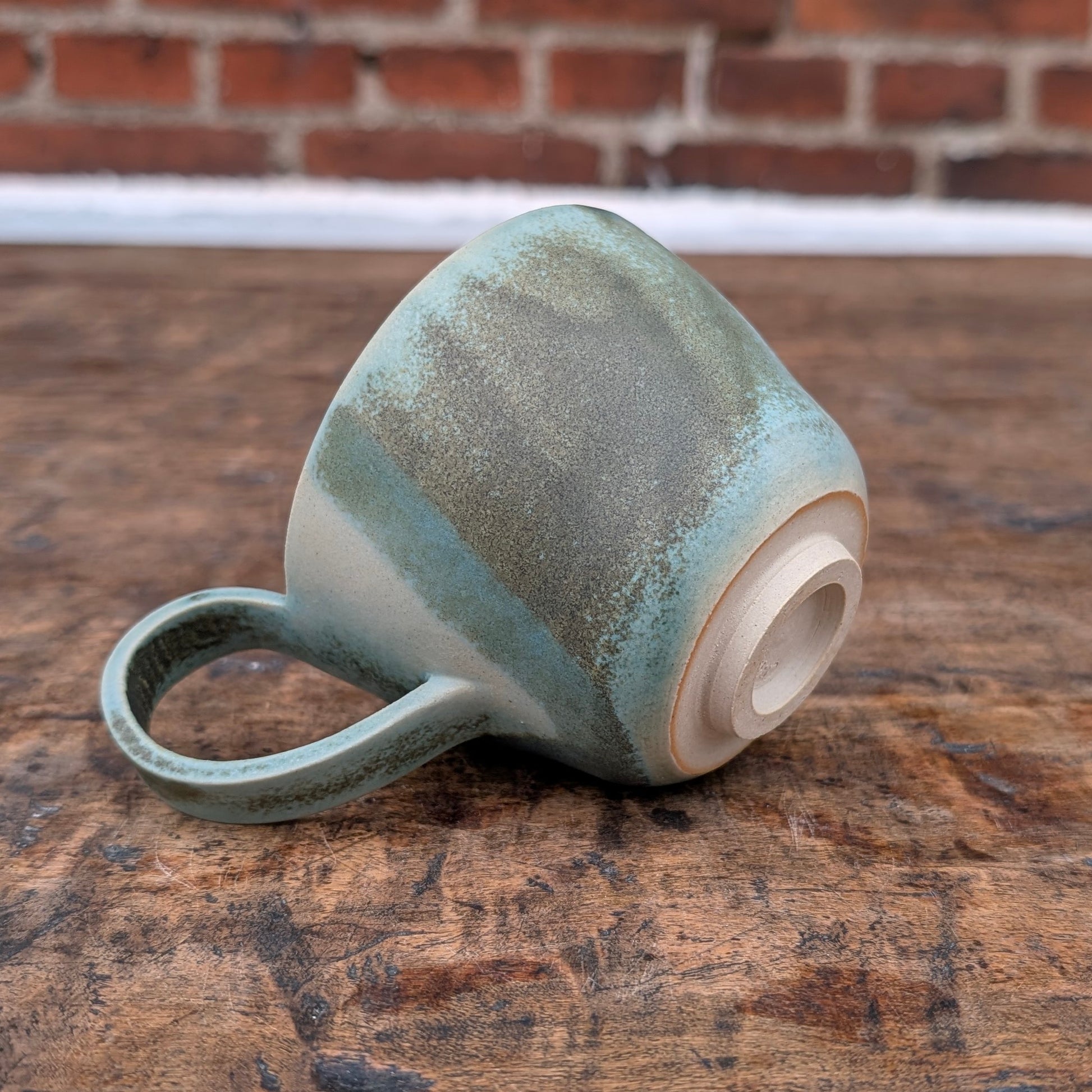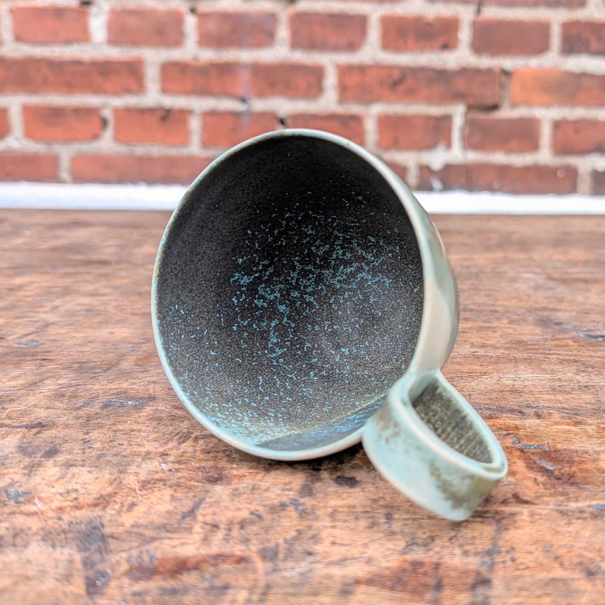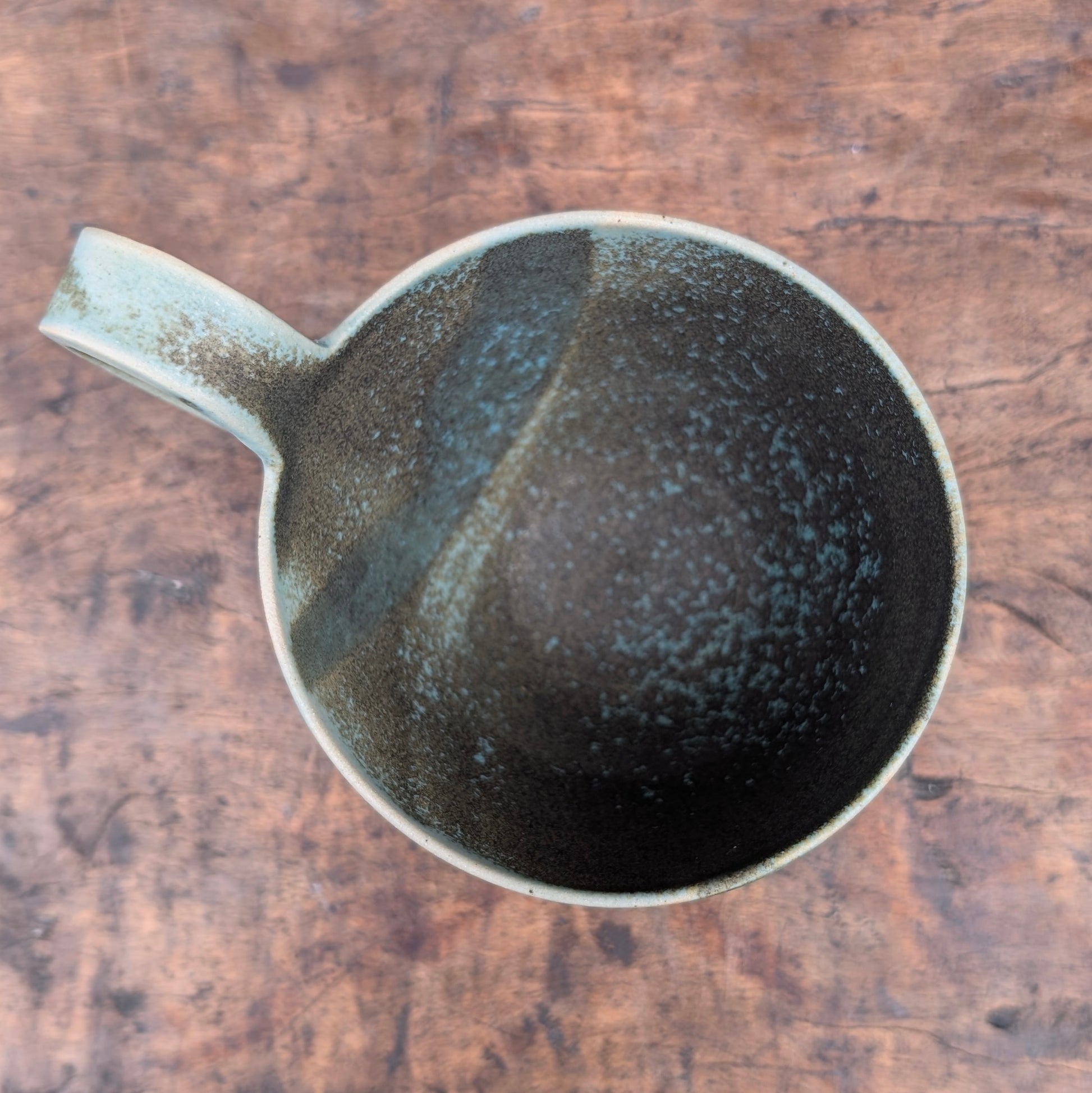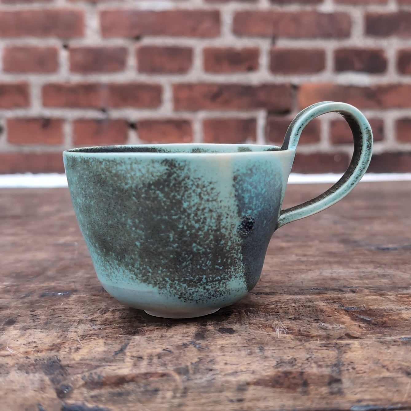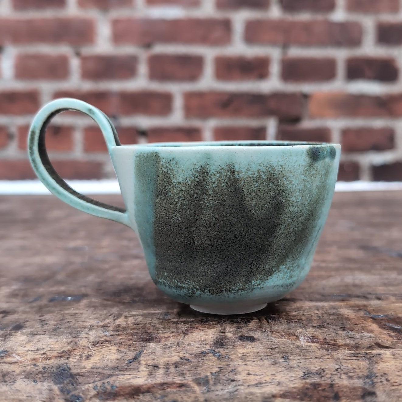 Skøn kop, med smukke kurver både på kroppen og hanken. Hanken er håndformet og sirligt påsat, så den smelter i ét med koppen. Nyd de smukke former og spillet i glasuren, når du drikker din kaffe af denne kop.