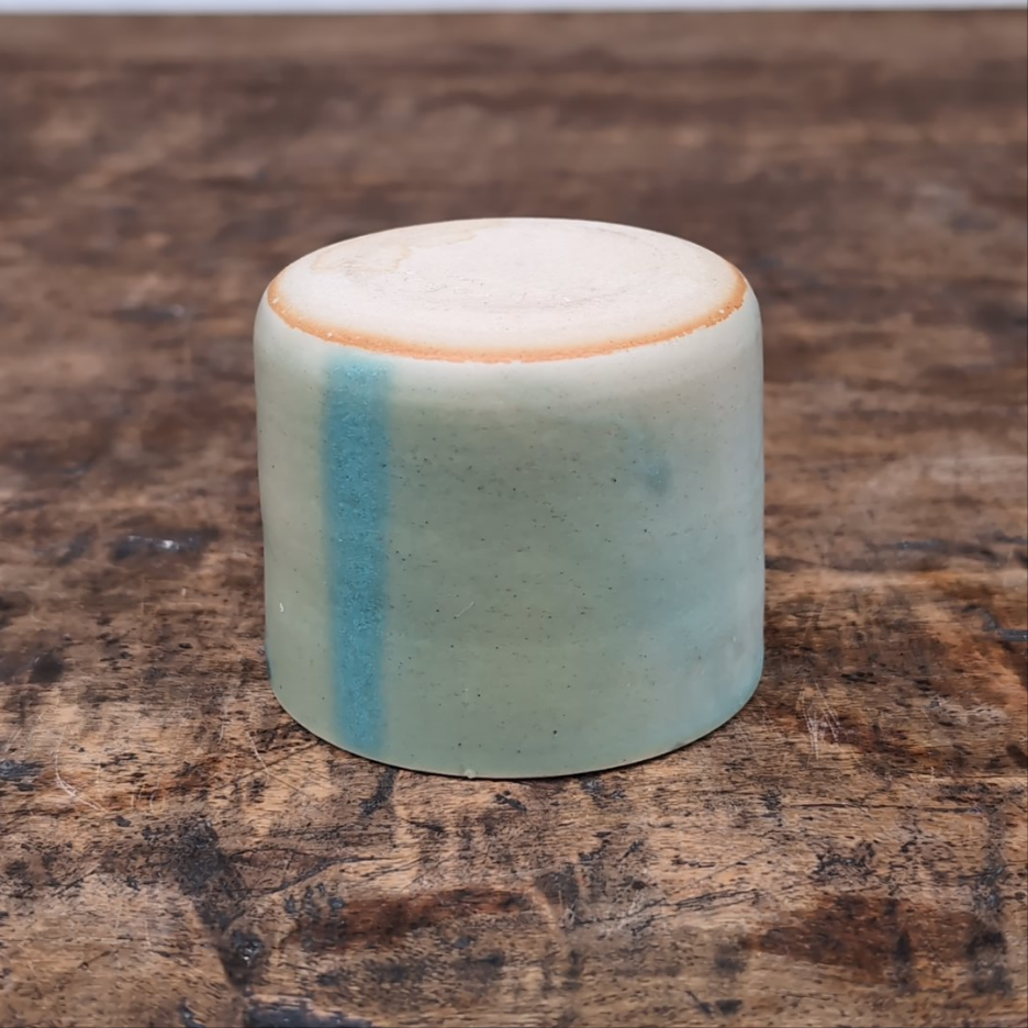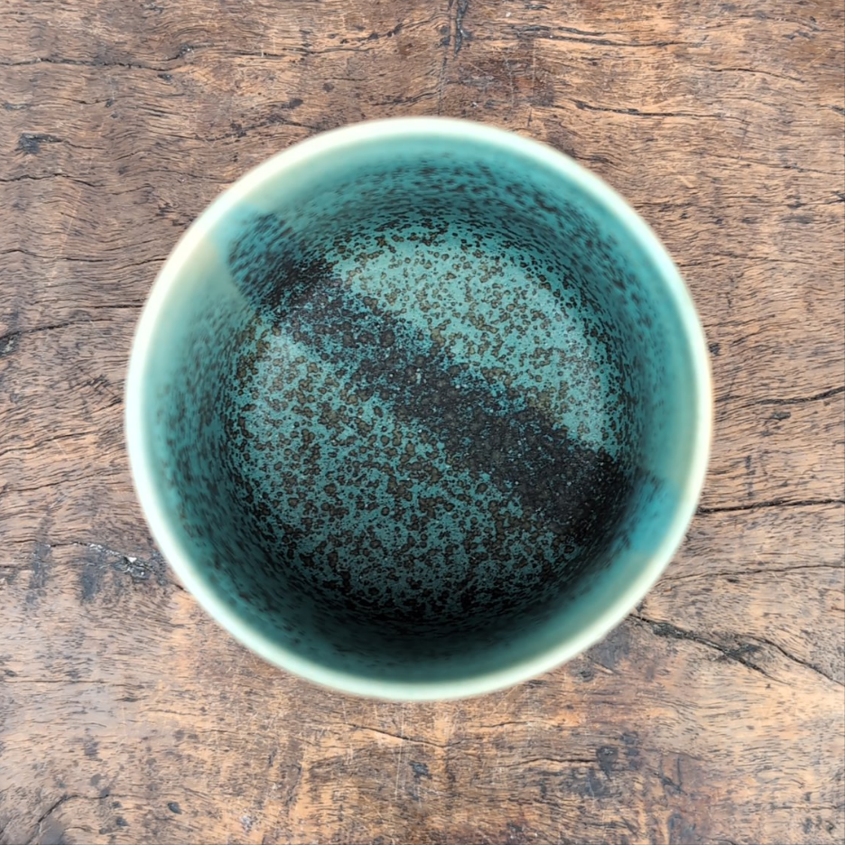 Finish: Grøn/turkis mat glasur med mørkt spil der varierer på overfladen fra yderside til inderside