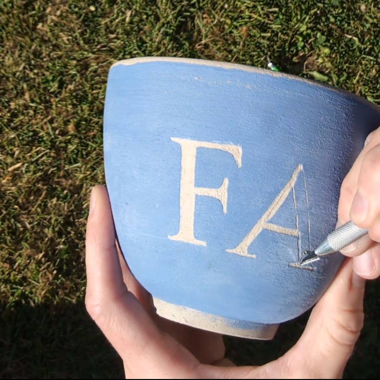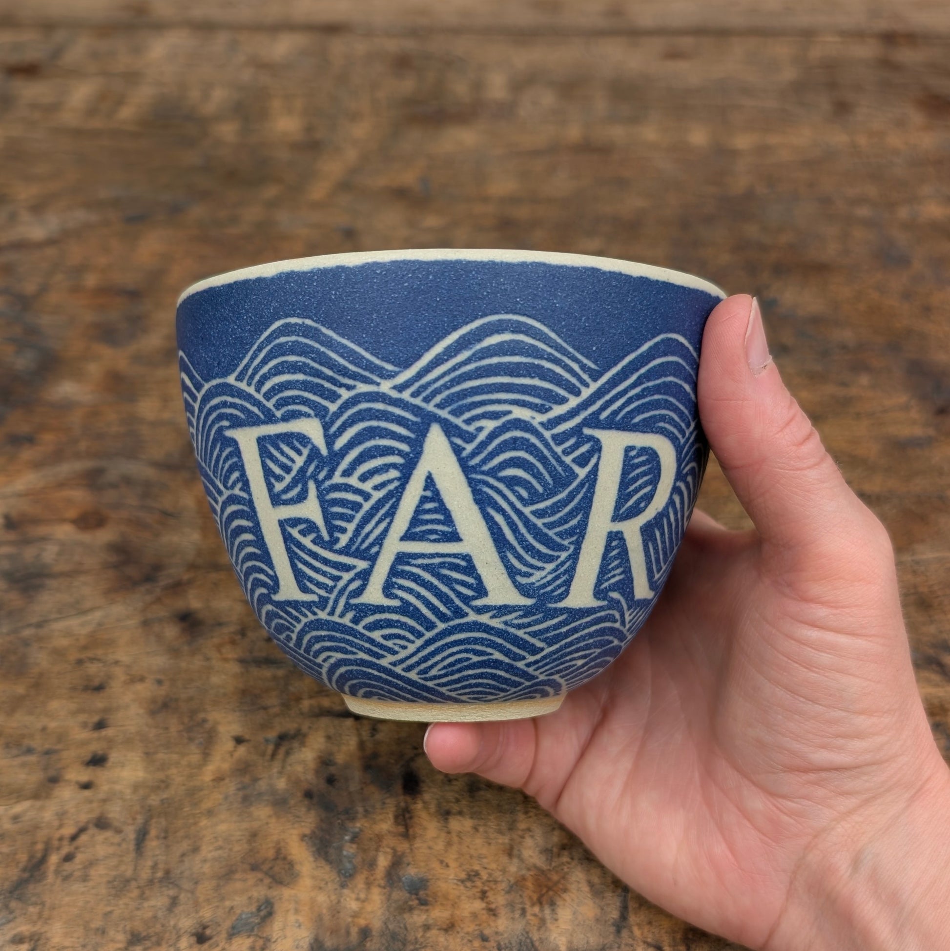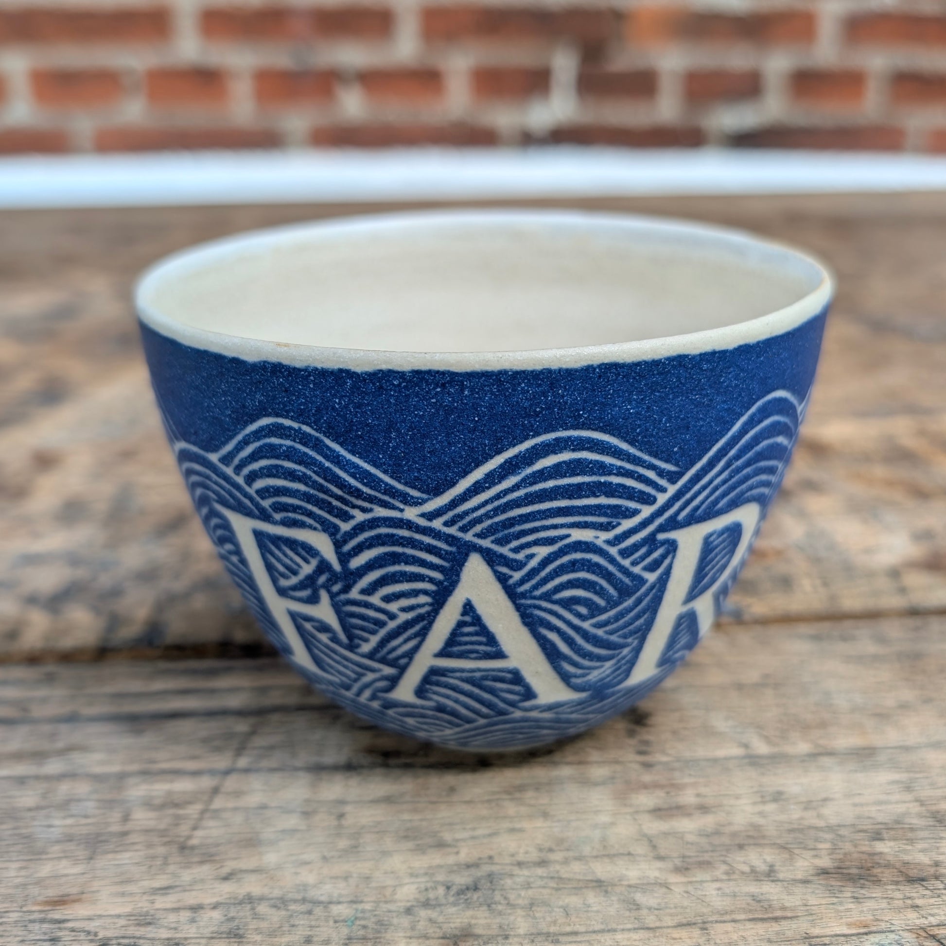 Skøn maritim "Far" kop. Lavet med sgraffito teknik, hvor det våde ler males med indfarvet ler. Dette skrabes væk så mønsteret kommer frem.