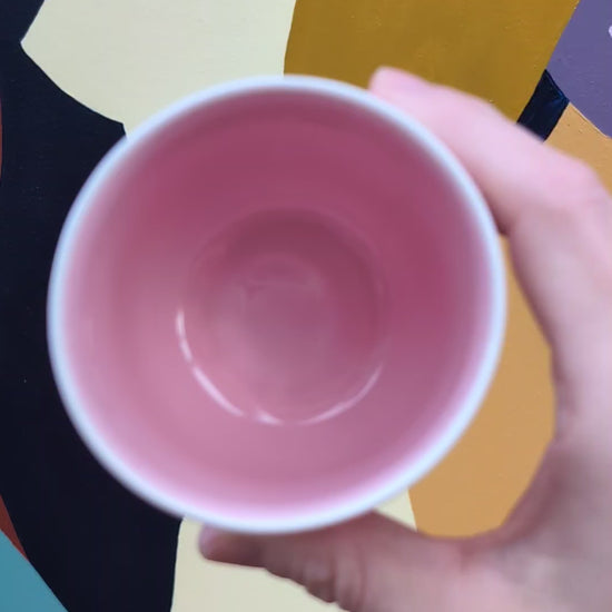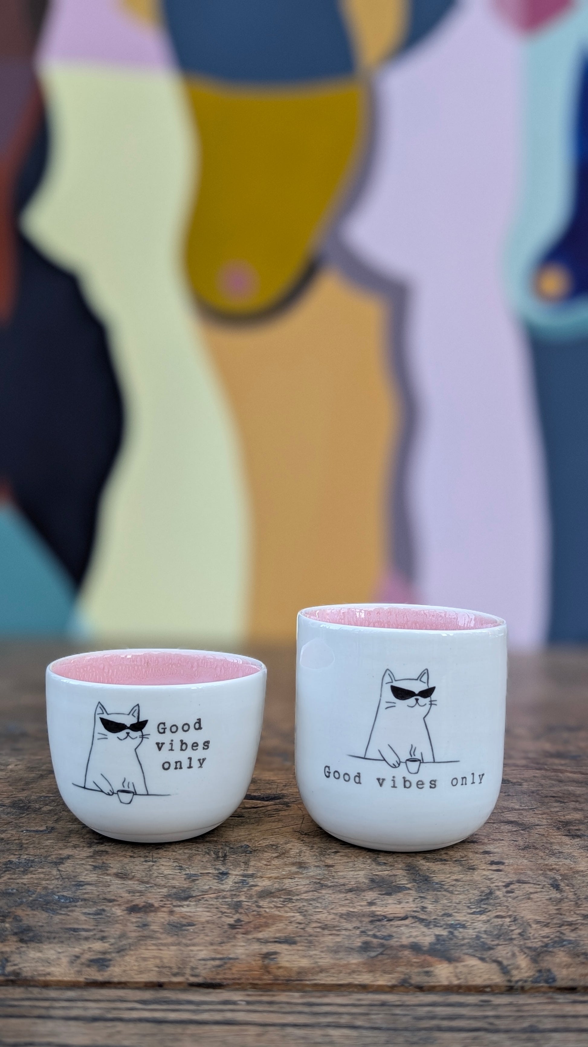 Start dagen og fortsæt den med den bedste indstilling "Good vibes only". Ingen plads til sure miner, bare lækker kaffe og keramik. Koppen er lavet i porcelæn, dekoreret med akvarel og indersiden har en skøn varm lyserød glasur, der understreger den gode stemning,