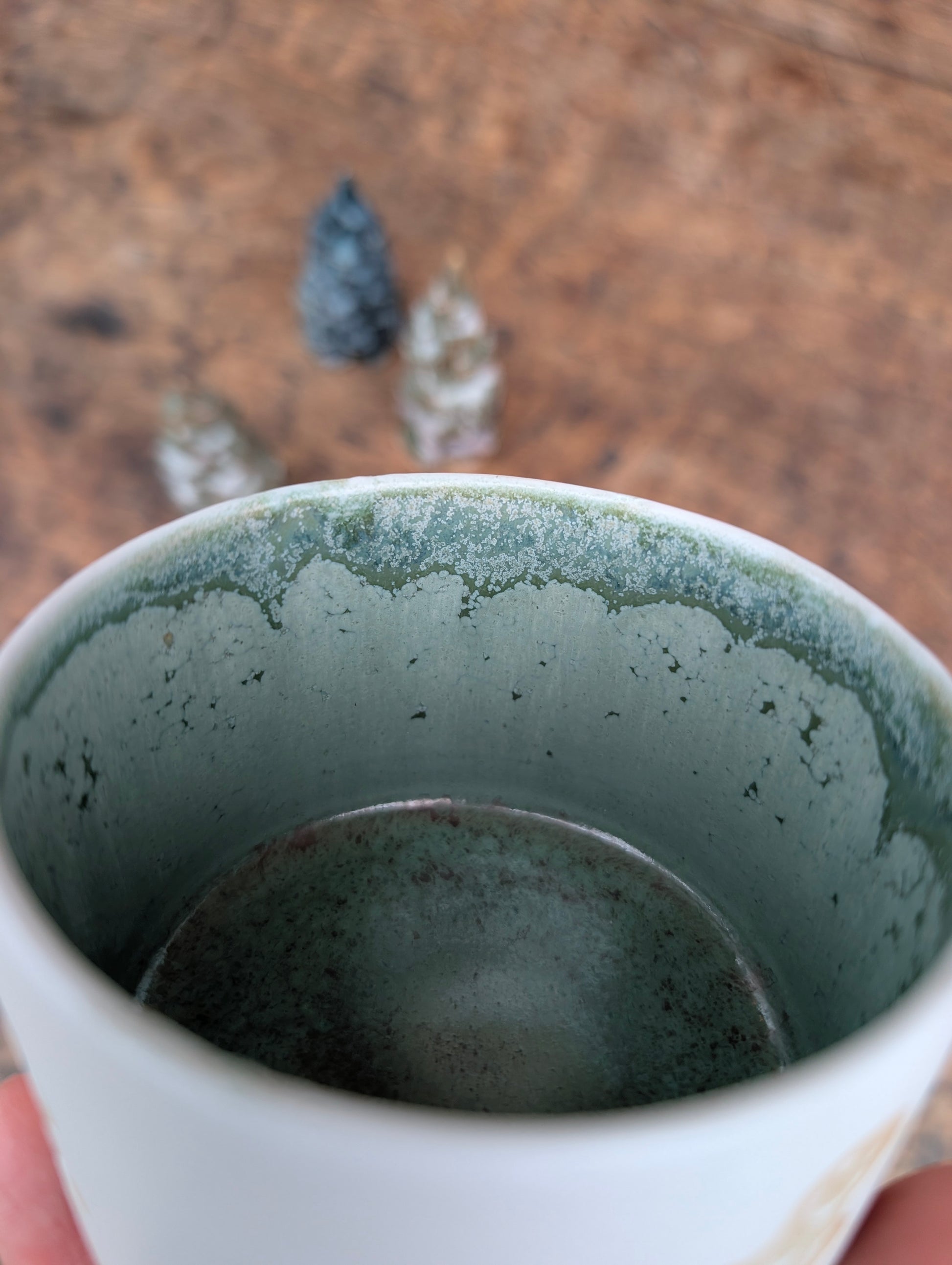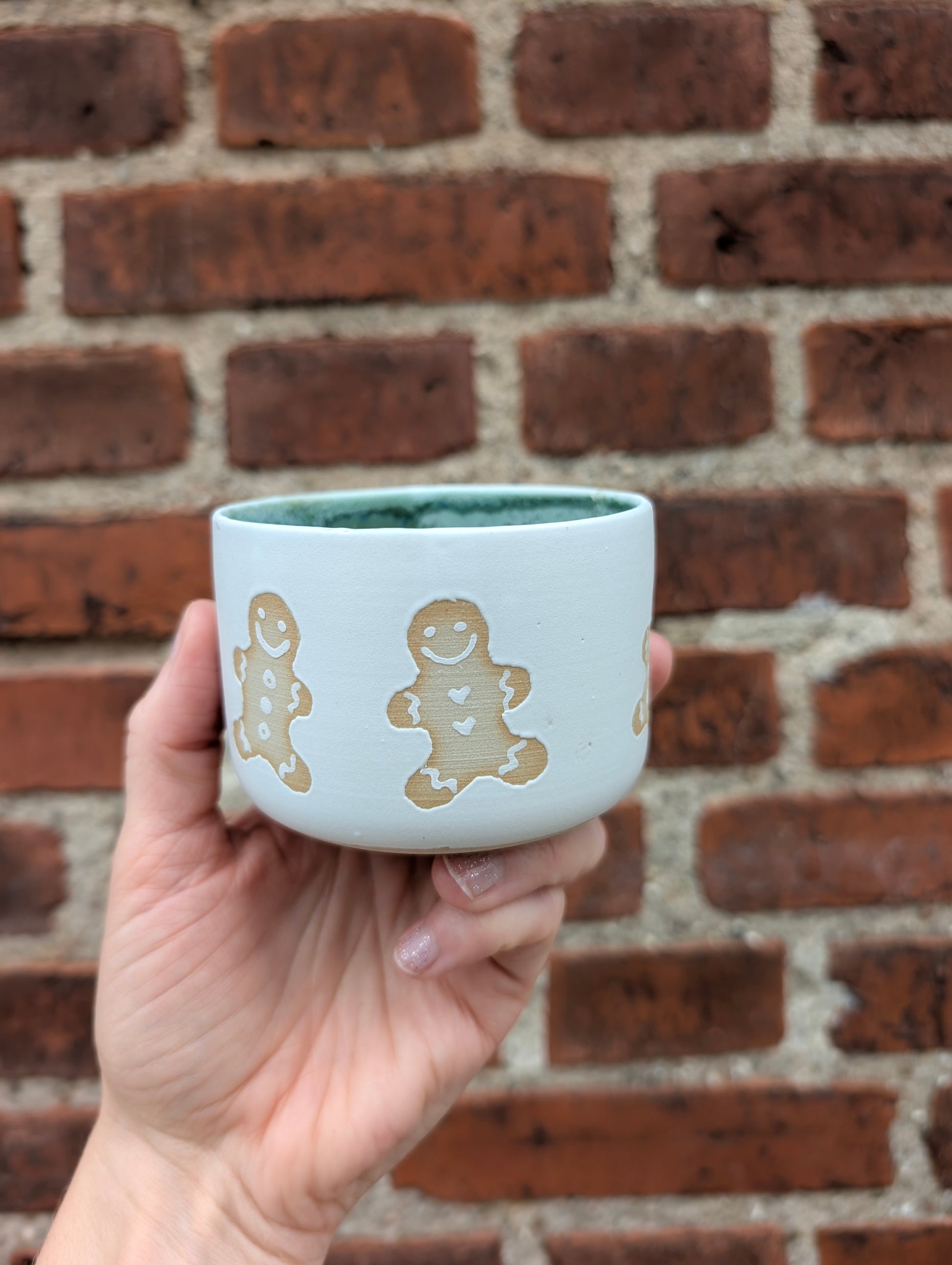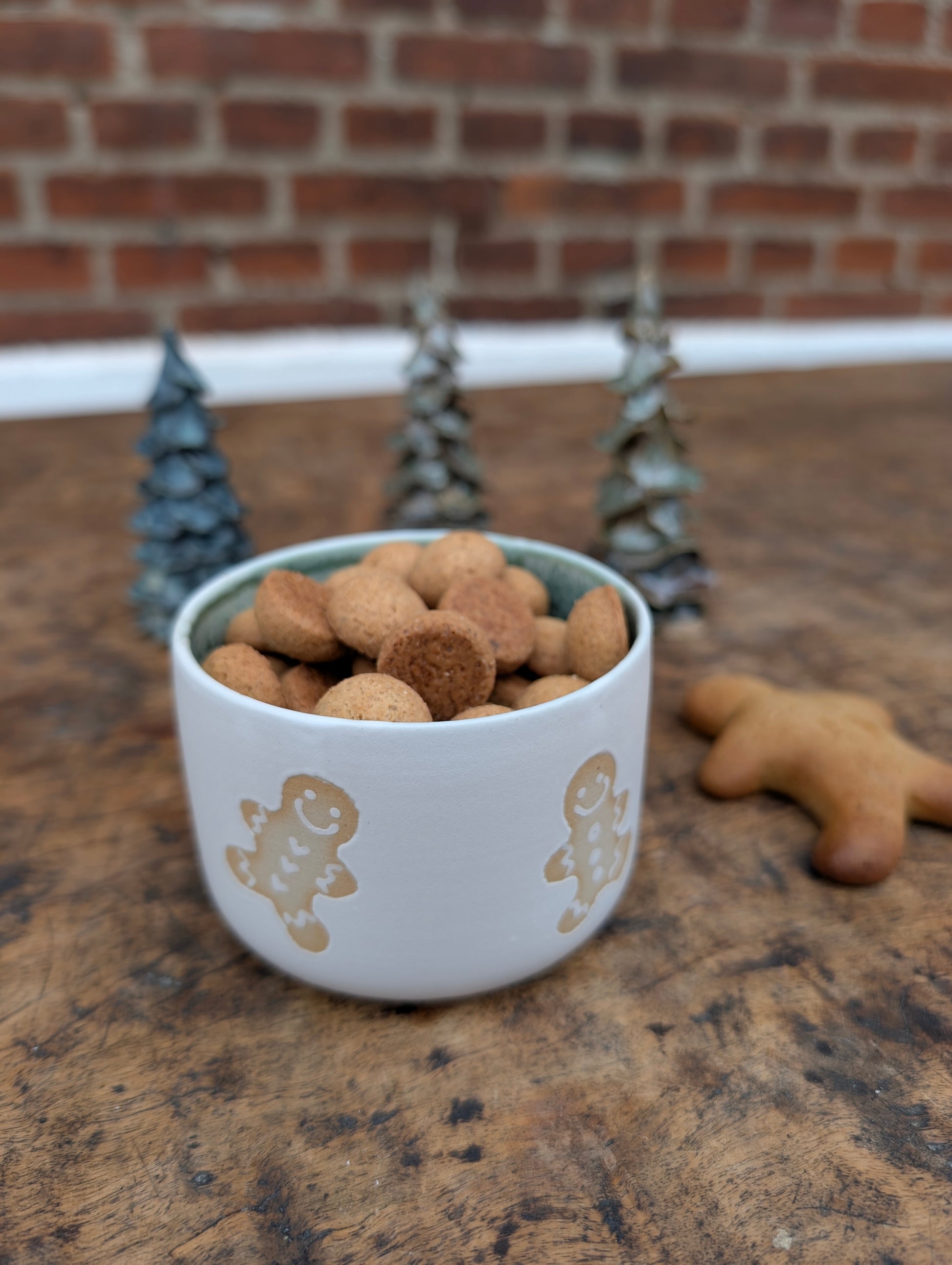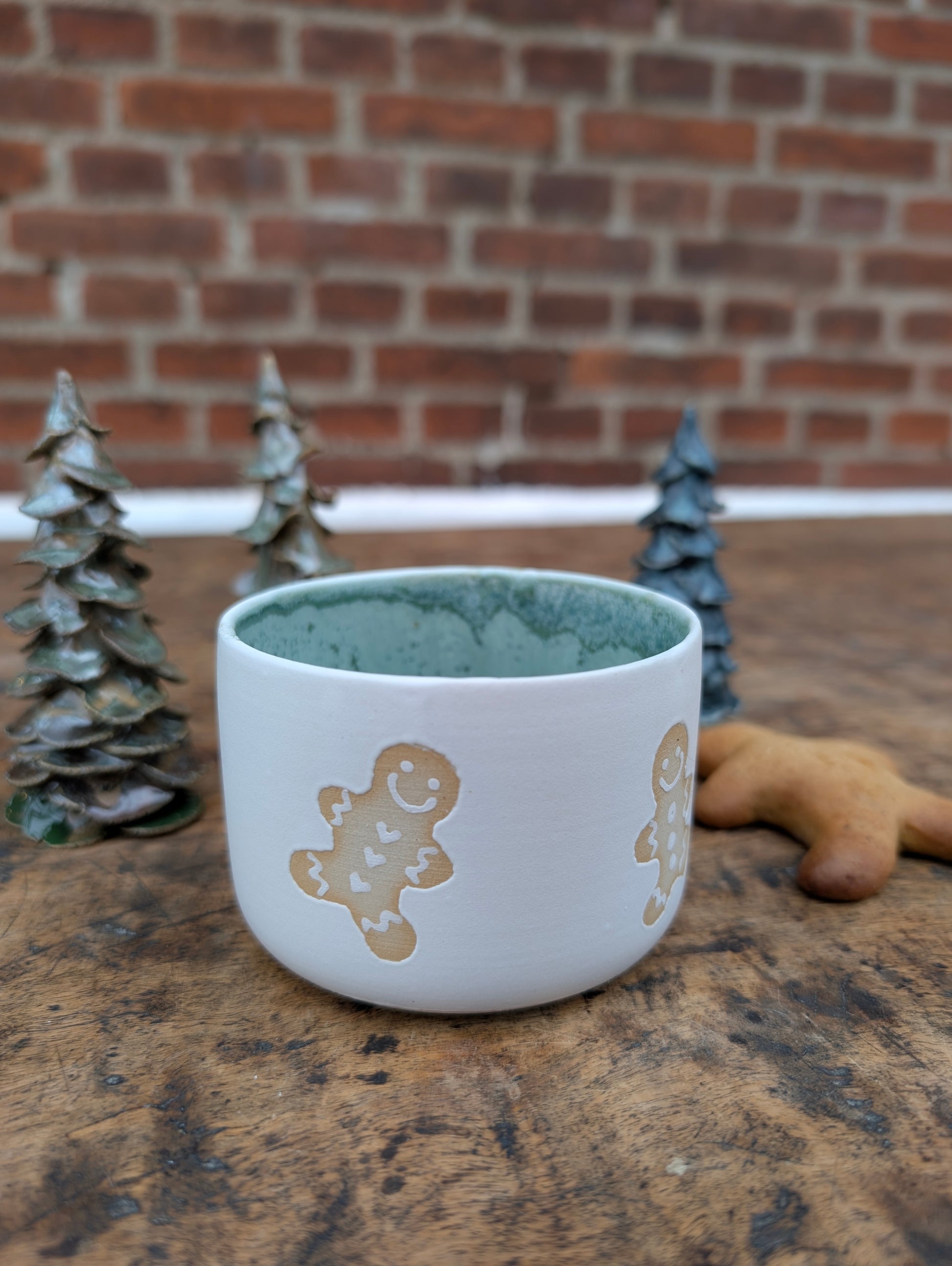 Smuk dekoreret julekop hvor ydersiden er dekoreret med glade honningkage mænd hele vejen rundt. Indersiden i en lækker grønlig krystal glasur, for at understrege vintertemaet. Hver enkel af dekorationerne er håndmalet på inden glasering.