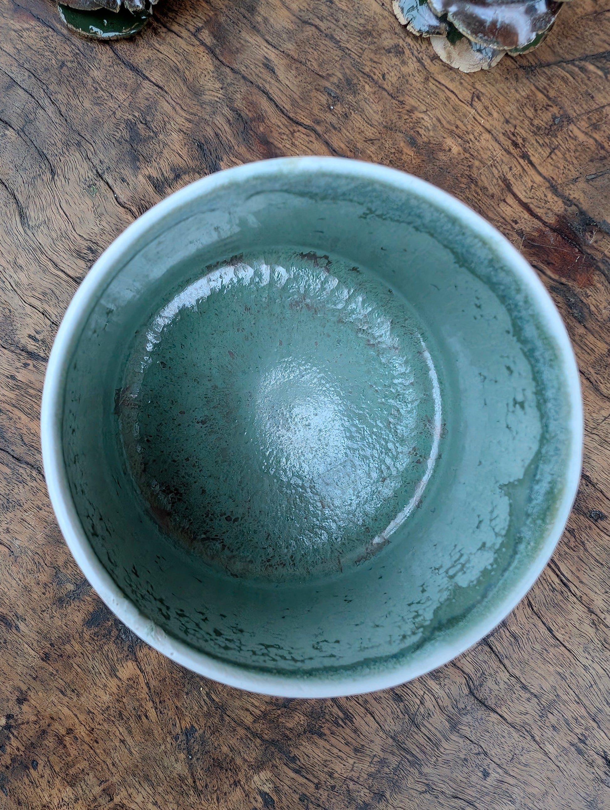 Finish: Blank klar glasur udvendigt, halvmat lyseblå glasur indvendigt