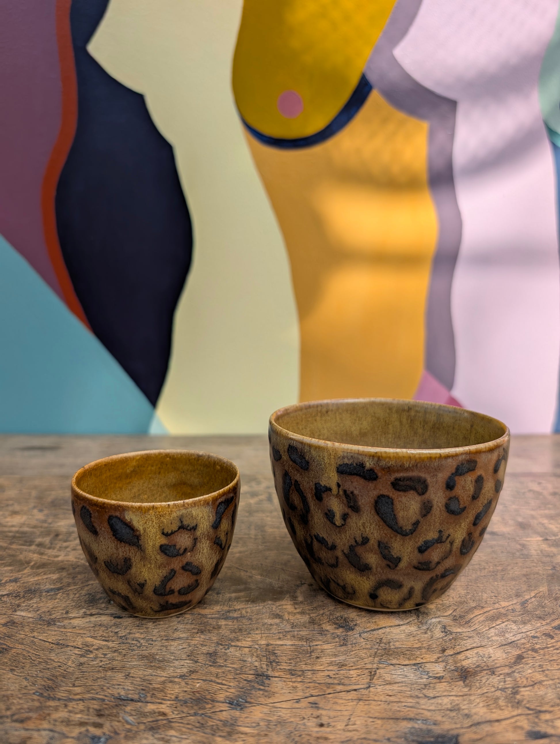Smuk dekoreret leopard kop med silkemat brun indre glasur. Hver enkel af leopardens pletter er håndmalet på for at opnå effekten. Du modtager et krus i denne smukke glasur – hvert enkelt er unikt, så det præcise udtryk kan variere fra dem på billederne.