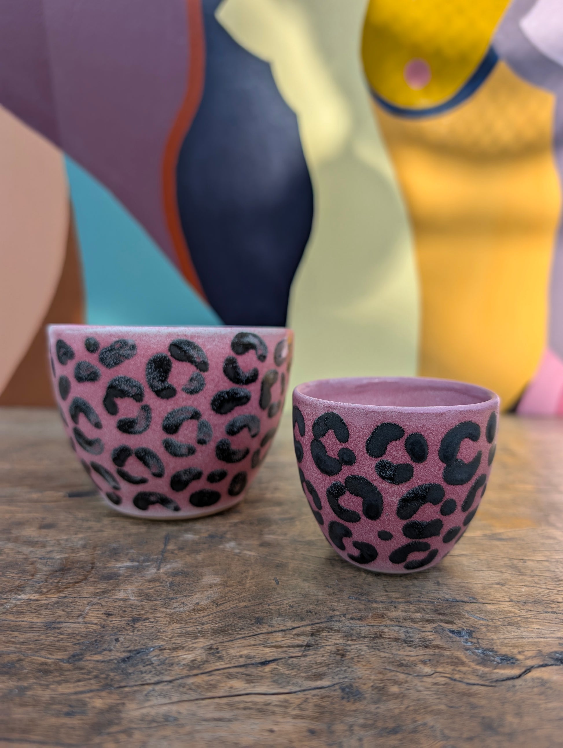 Smuk dekoreret Lyserød leopard kop. Hver enkel af leopardens pletter er håndmalet på for at opnå effekten. Du modtager et krus i denne smukke glasur – hvert enkelt er unikt, så det præcise udtryk kan variere fra dem på billederne.