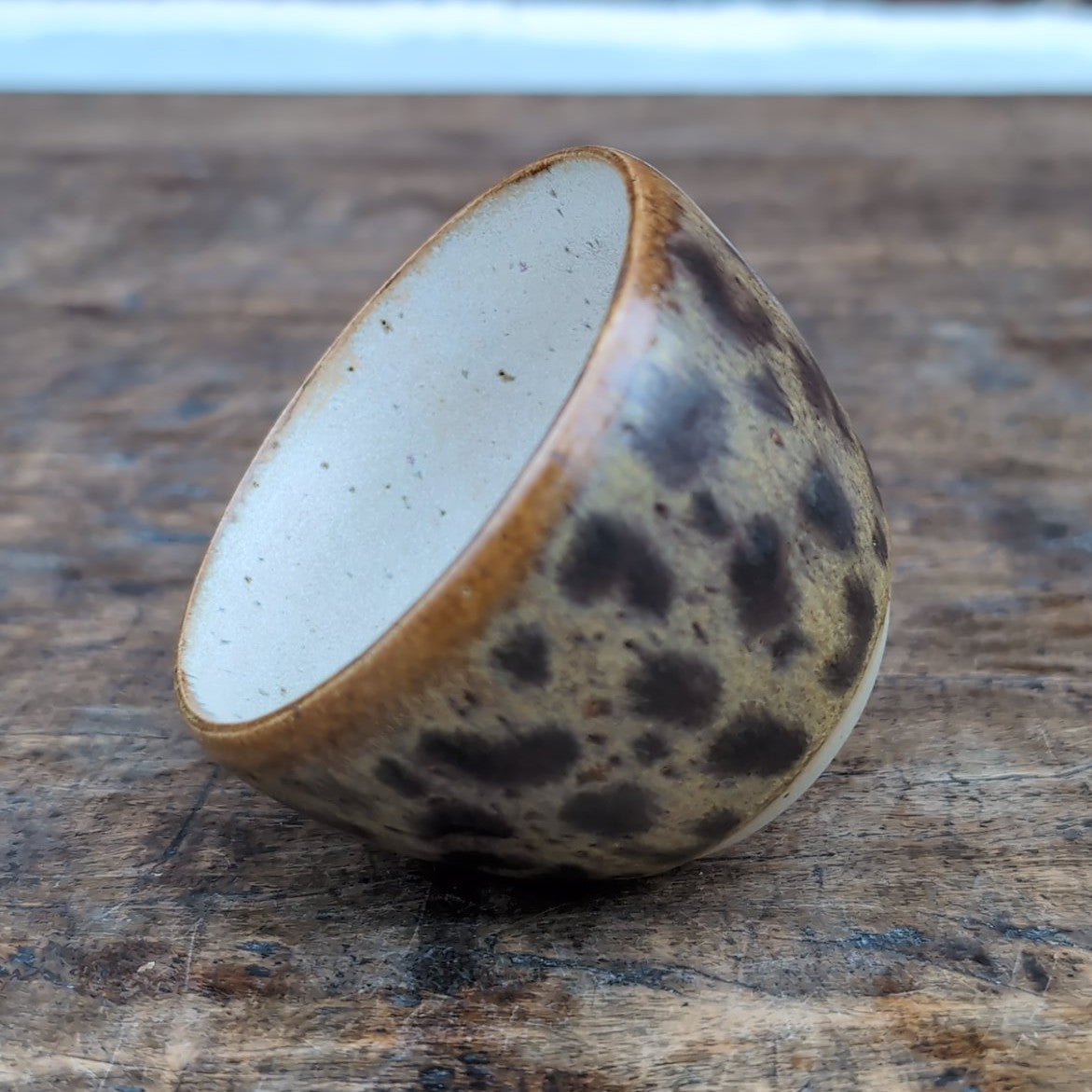 Buttet leopard kop, der ligger perfekt i hånden. Skøn silkemat leopard pryder ydersiden, til kontrast til den creme hvide inderside, hvor lavapletter smukt bryder igennem.