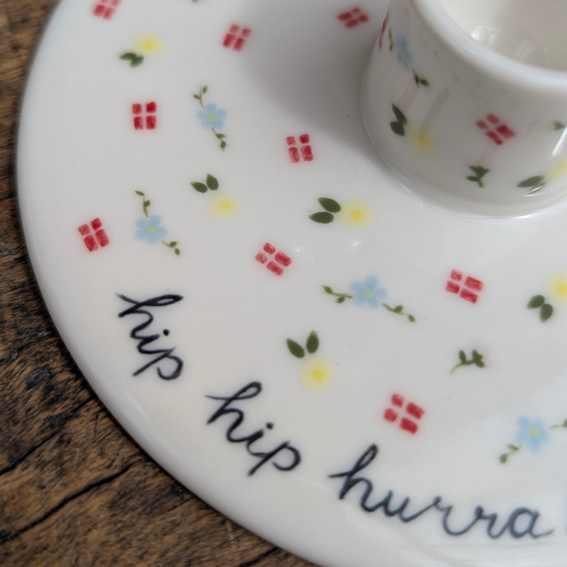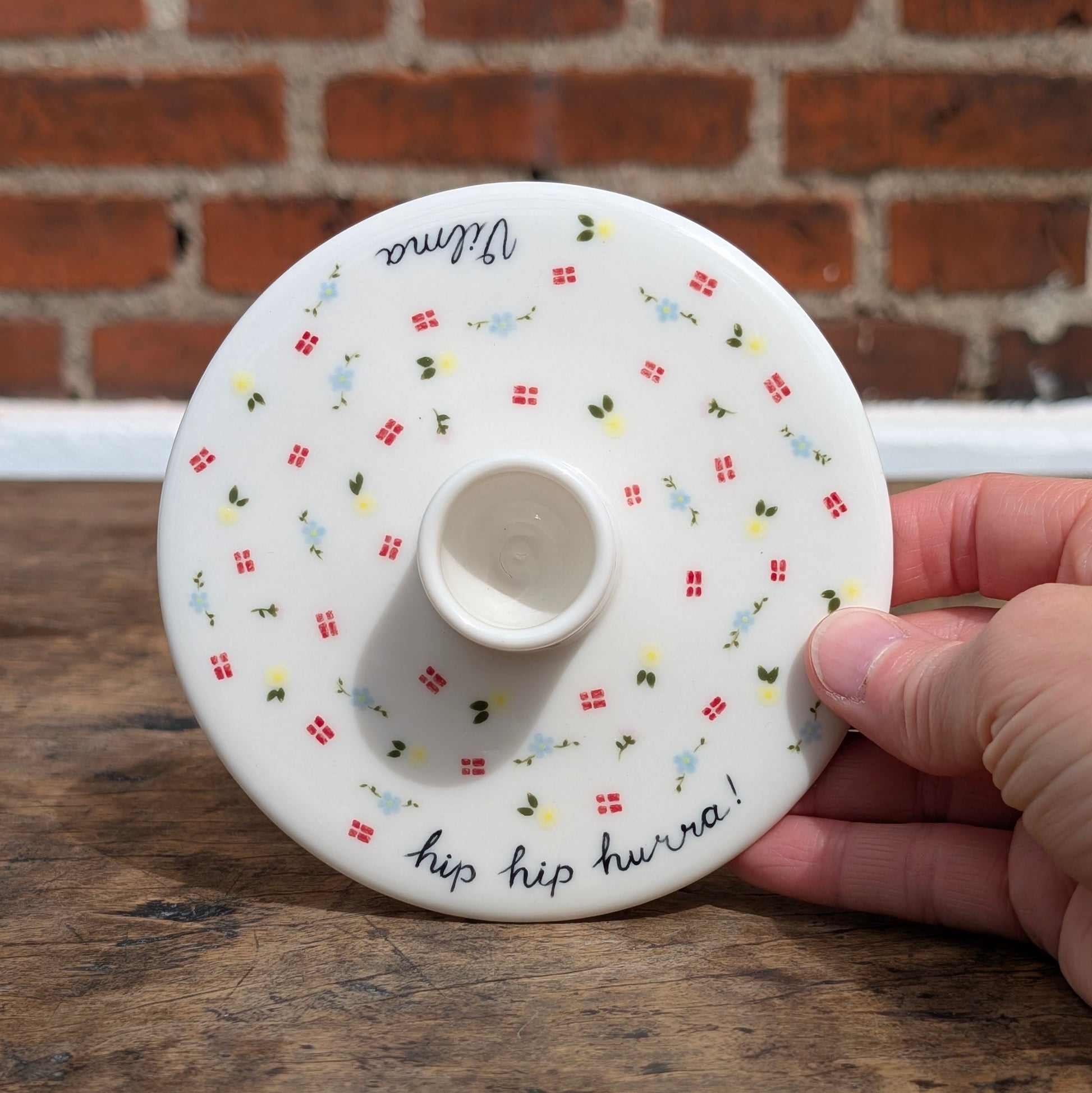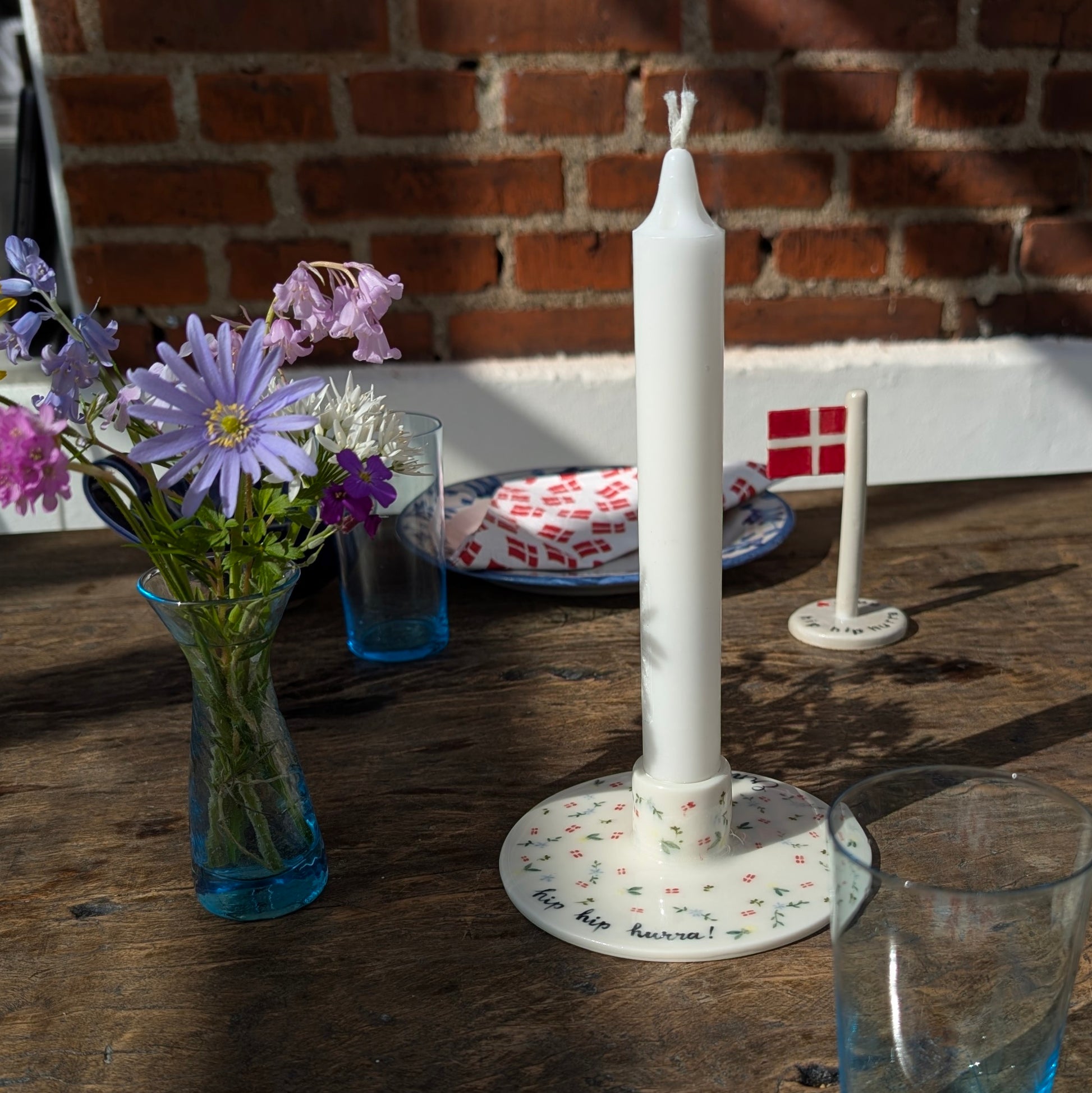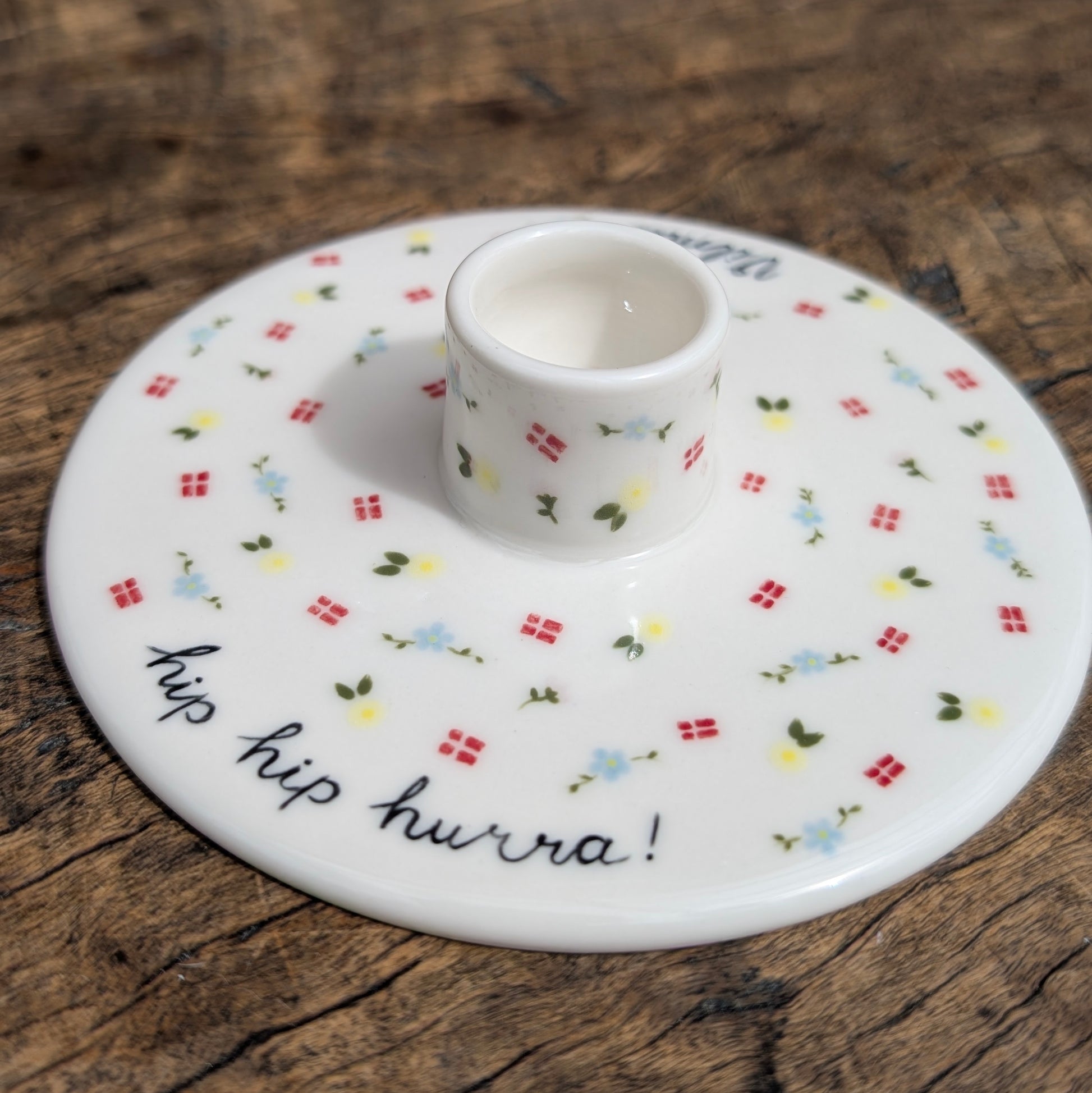 Smuk personlig lysestage drejet i porcelæn, perfekt til alle årets fejringer. Jeg dekorerer stagen med flag og blomster, og som udgangspunkt teksten "hip hip hurra!" samt et valgfrit navn. Du har dog også mulighed for at undlade navnet, så alle i familien kan bruge den. Perfekt som gave til dåb, fødselsdag, bryllup, konfirmation - kun fantasien sætter grænser. En mulighed er fx også "Tillykke" og så brudeparrets navne eller festens hovedperson.