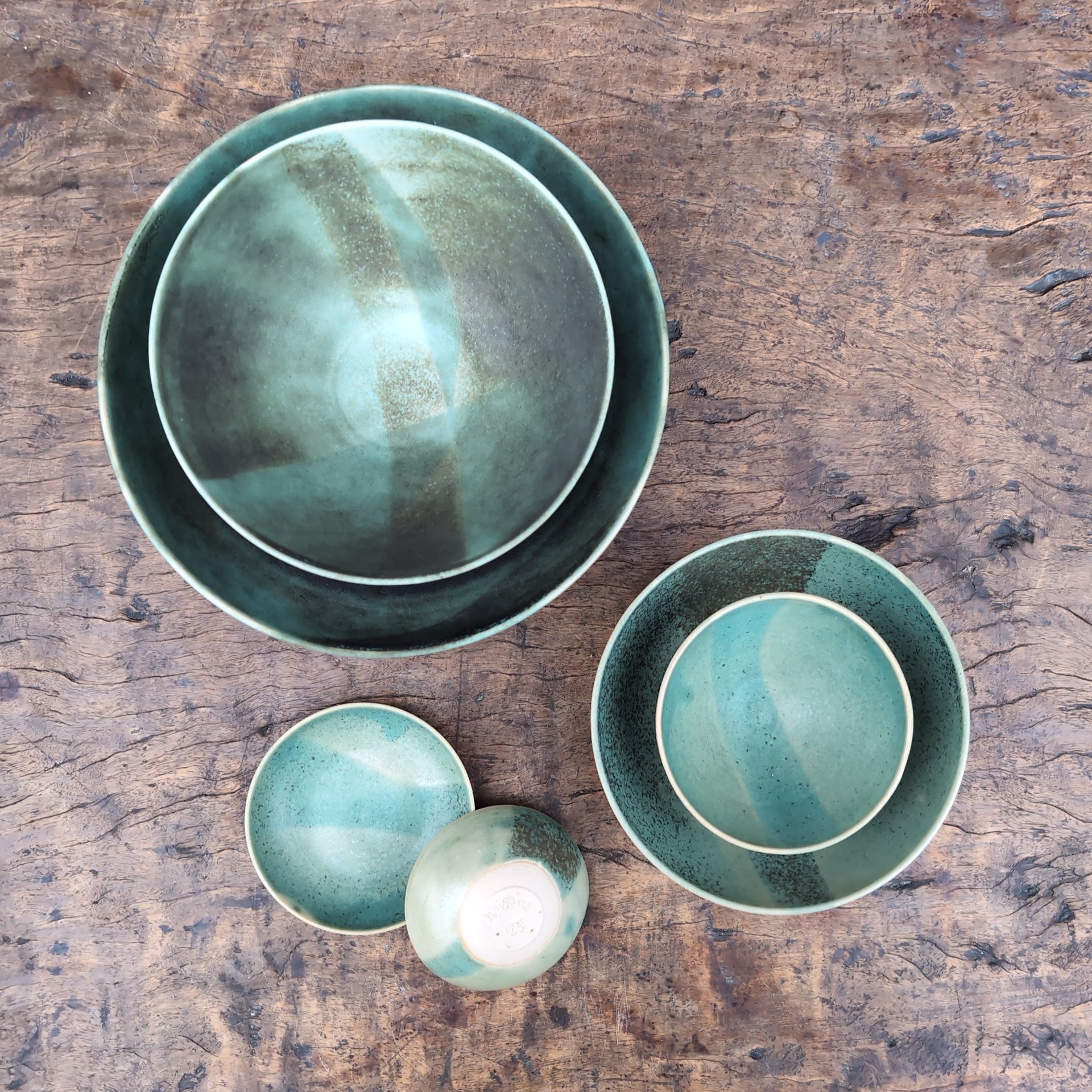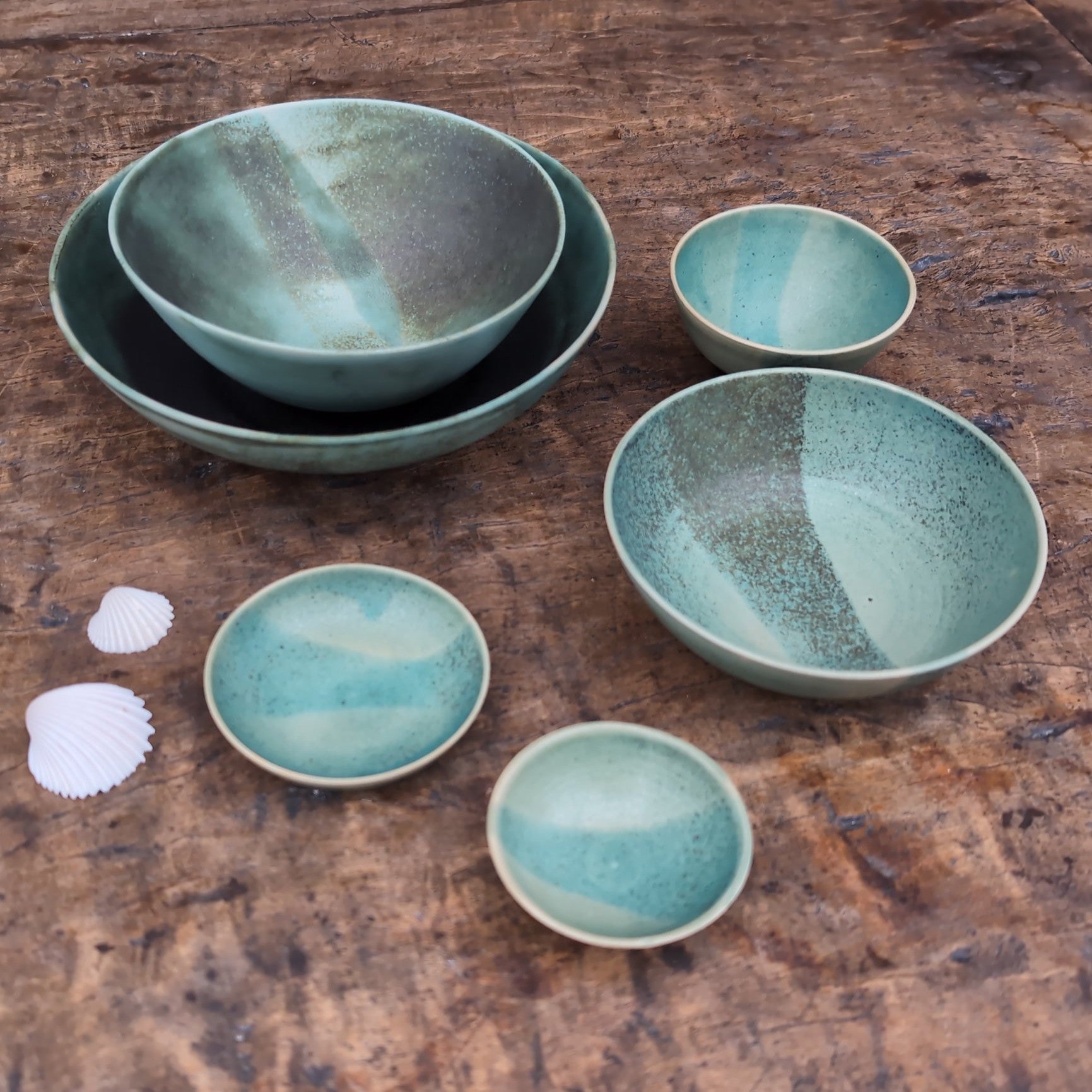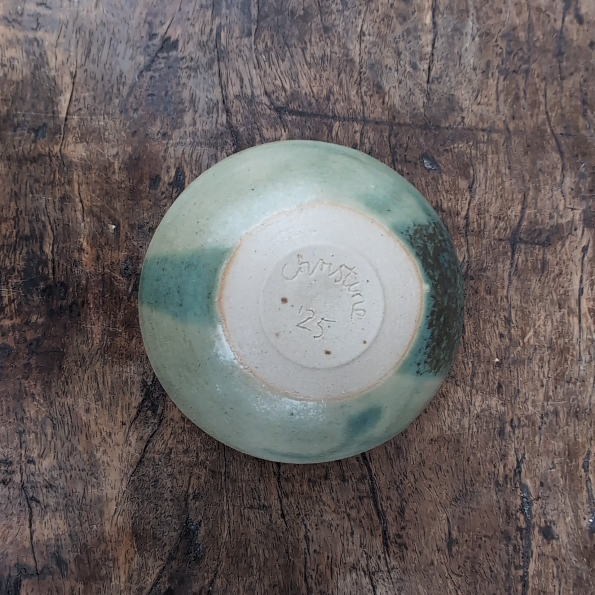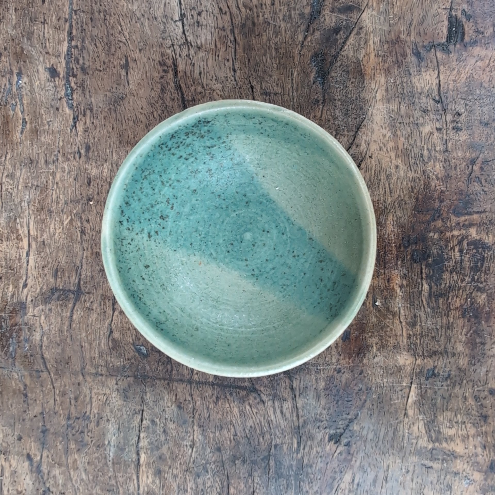 Finish: Grøn/turkis mat glasur med mørkt spil der varierer på overfladen fra yderside til inderside