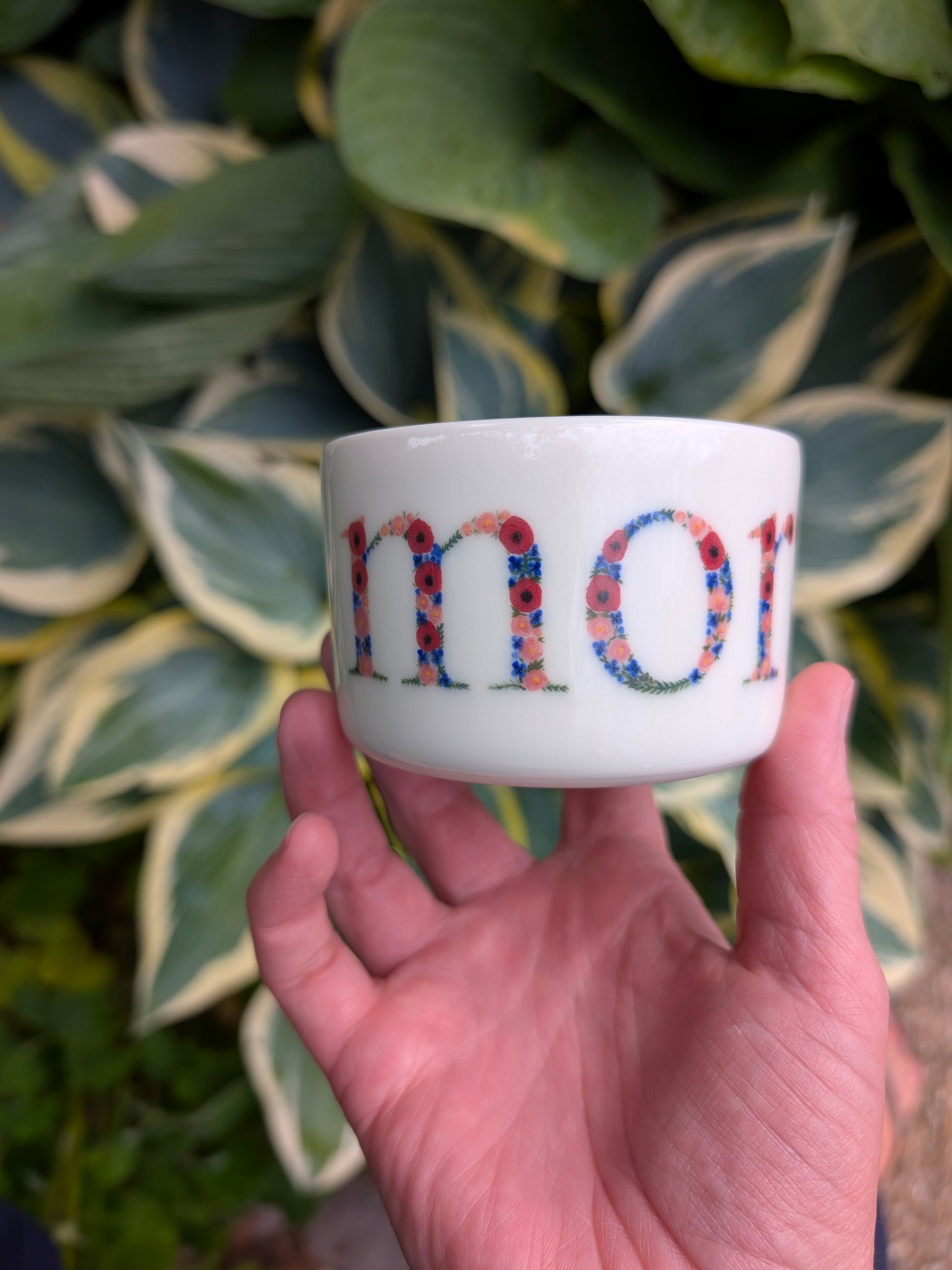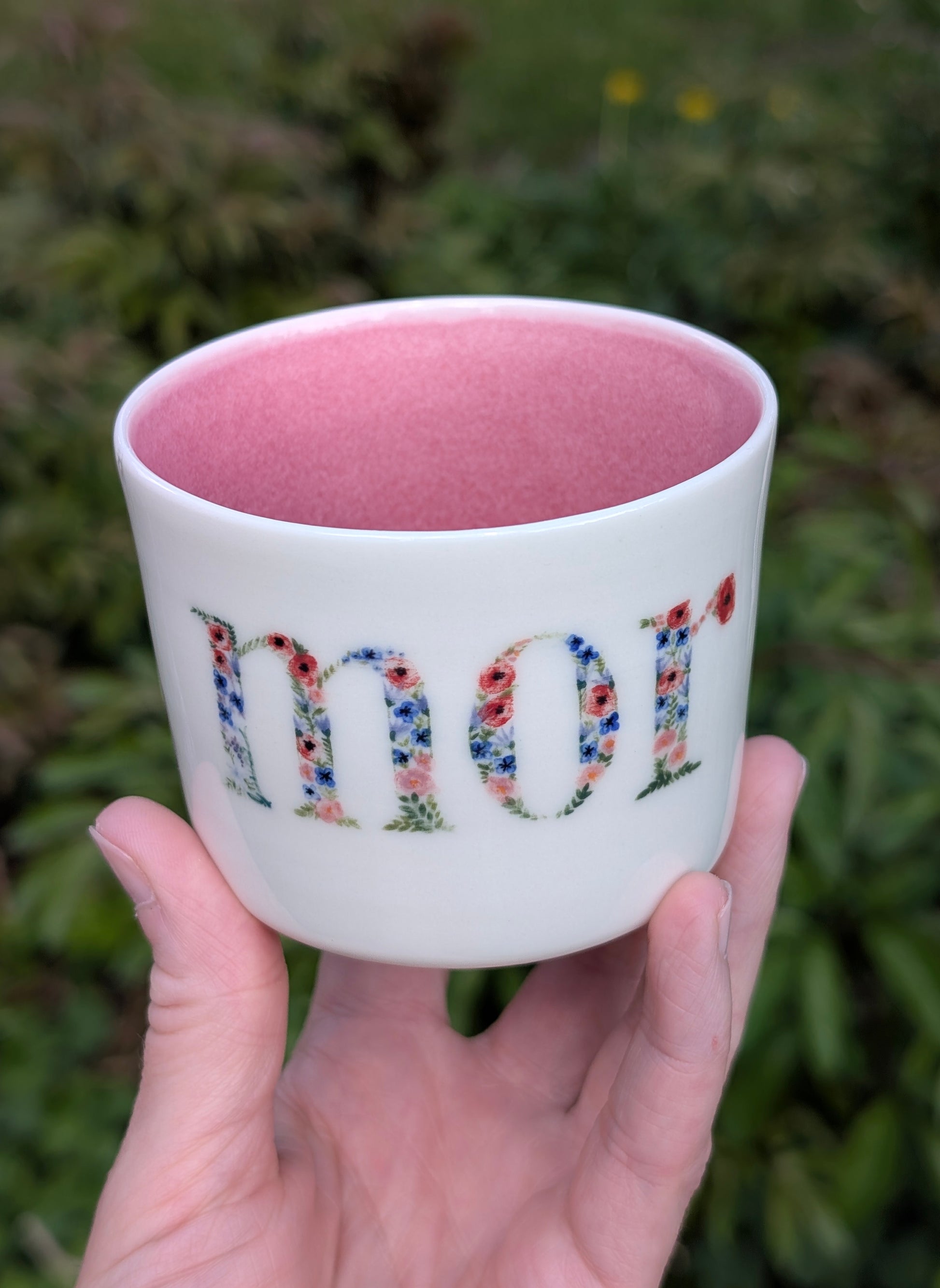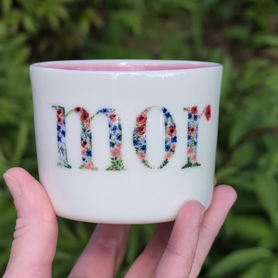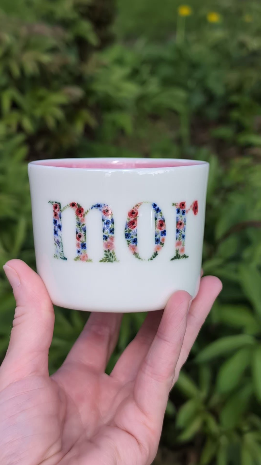 Smuk personlig kop drejet i porcelæn, dedikeret til alle de fantastiske mødre. Jeg dekorerer koppen med blomster og løv så dekorationen udgør hvert bogstav. Koppen glaseres som udgangspunkt lyserød indvendigt og med blomster i farverne som vist på den lyserøde, men skriv endelig hvis du har andre ønsker.