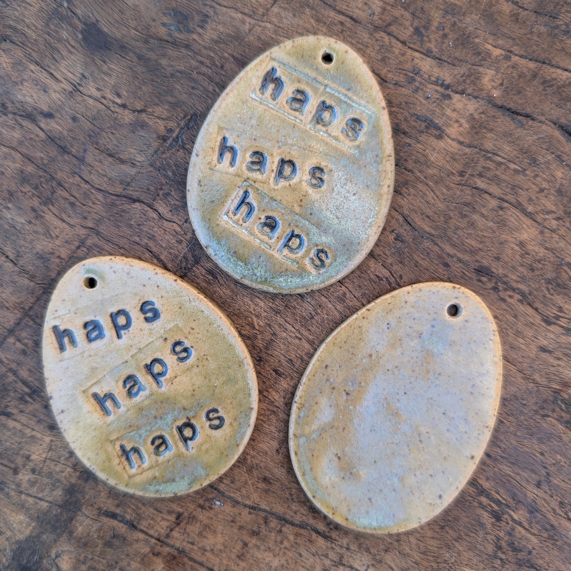 Fine påskeæg med stemplet "haps haps haps". Æggene er på størrelse med et hønseæg. Glaseret på begge sider, i en smuk grønlig glasur, der også lader lavaleren lyse igennem, med masser af spil. Mørk underfarve i teksten. Smuk på forårsgrene i en vase, sammen med mine æggeornamenter og påskeharer.