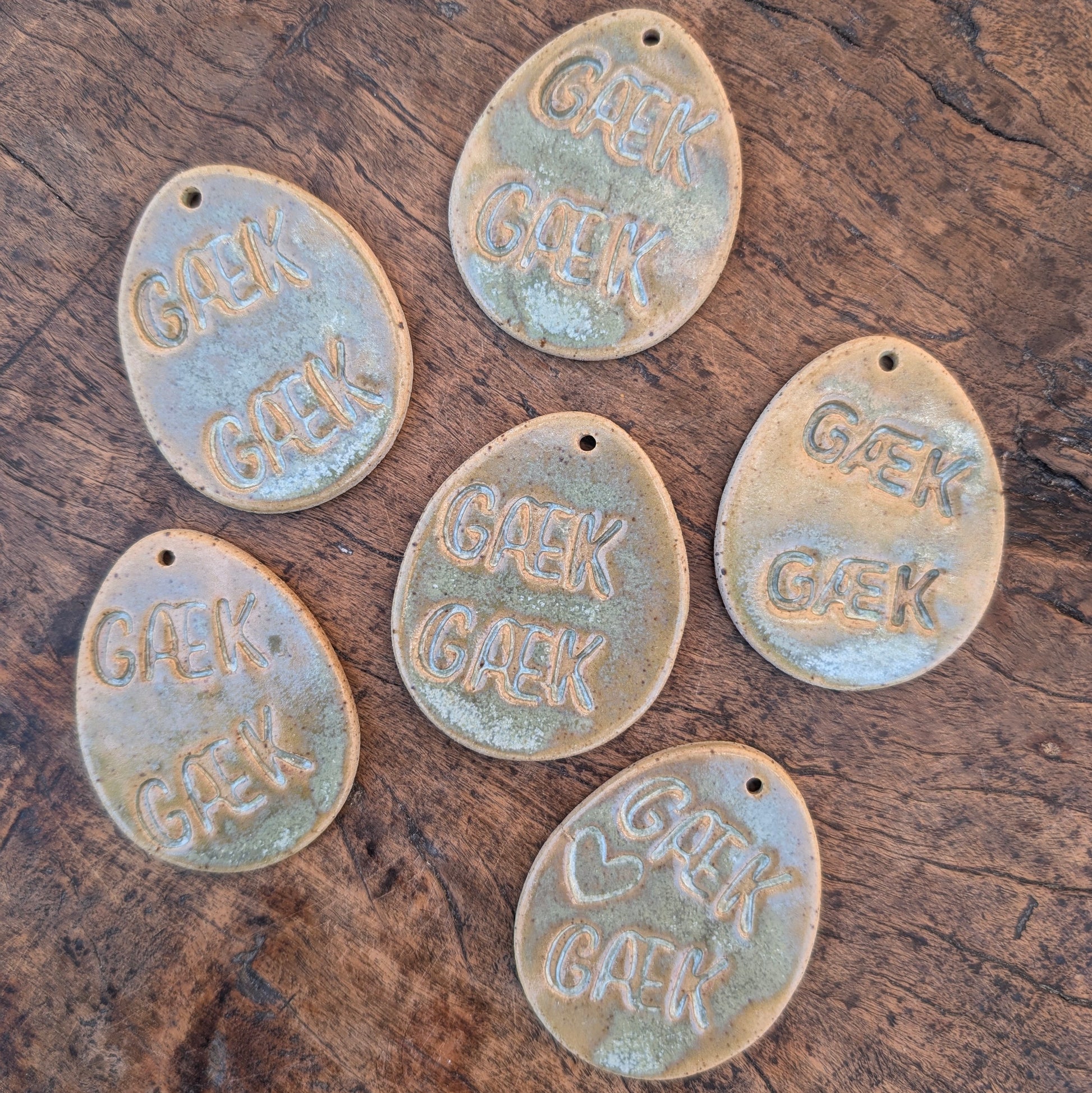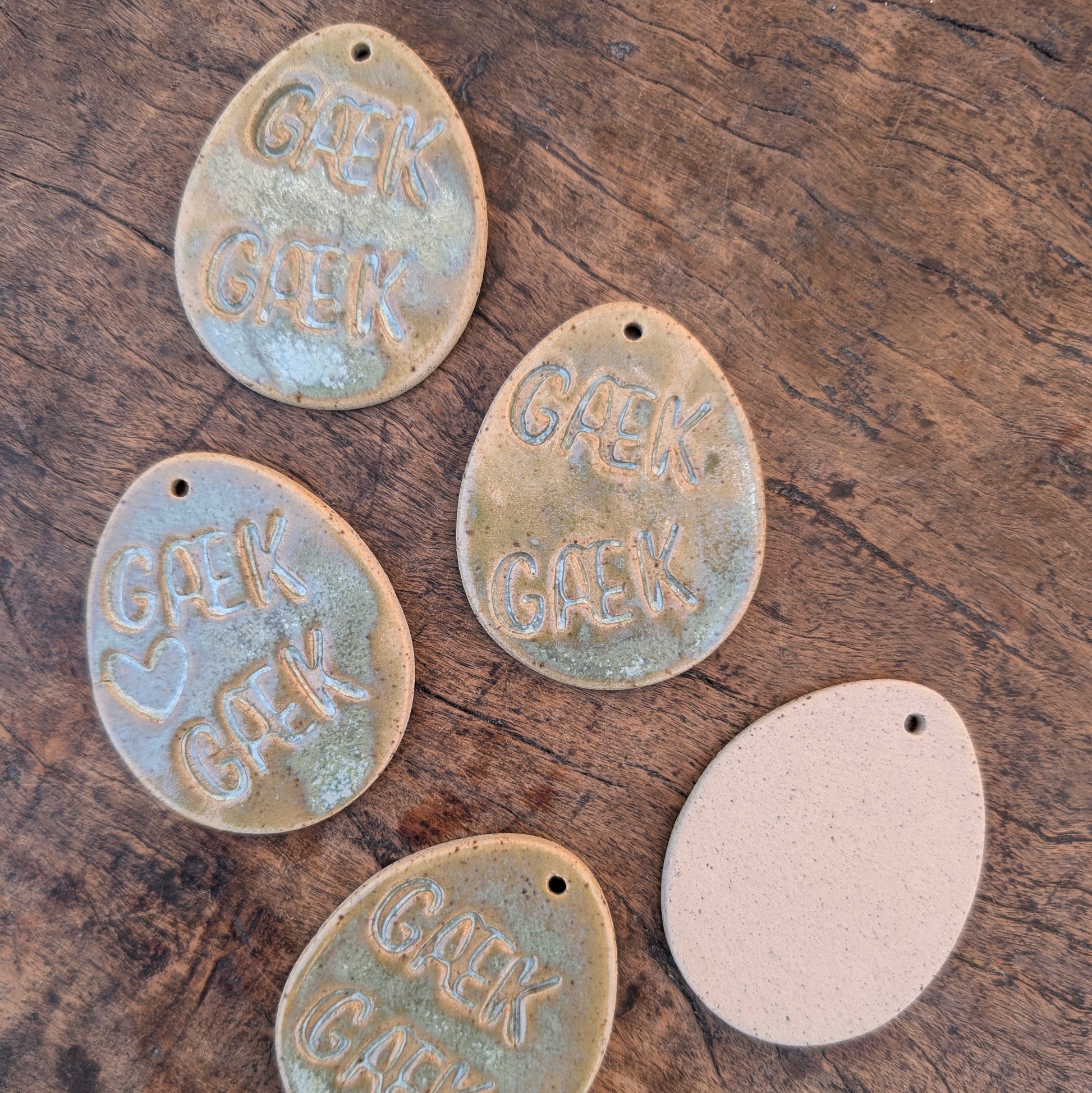 Fine påskeæg med stemplet "Gæk gæk". Æggene er på størrelse med et hønseæg. Glaseret i en smuk grønlig glasur, der også lader lavaleren lyse igennem, med masser af spil. Smuk på forårsgrene i en vase, sammen med mine æggeornamenter og påskeharer.