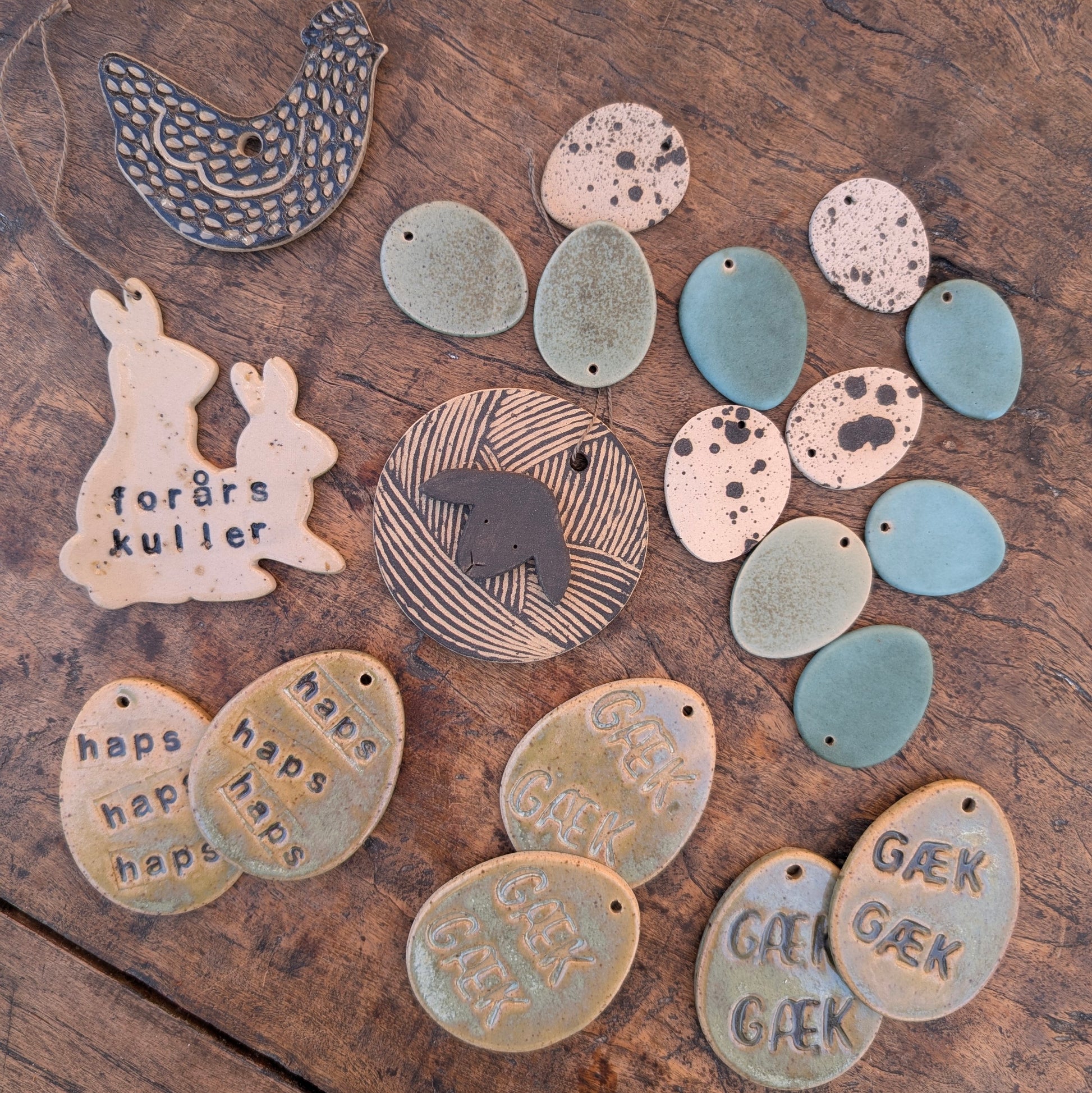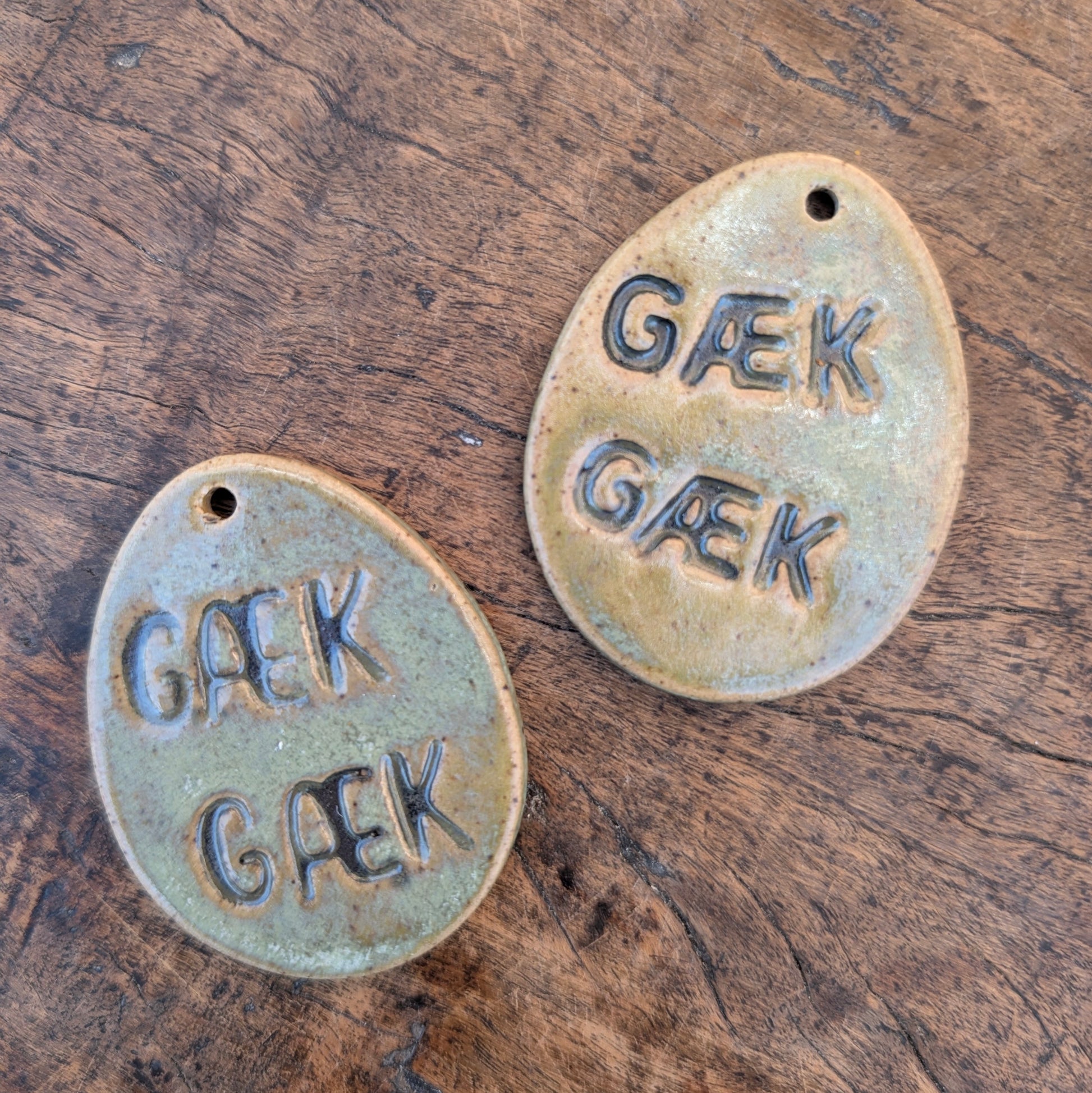 Fine påskeæg med stemplet "Gæk gæk". Æggene er på størrelse med et hønseæg. Glaseret på begge sider, i en smuk grønlig glasur, der også lader lavaleren lyse igennem, med masser af spil. Mørk underfarve i teksten. Smuk på forårsgrene i en vase, sammen med mine æggeornamenter og påskeharer.