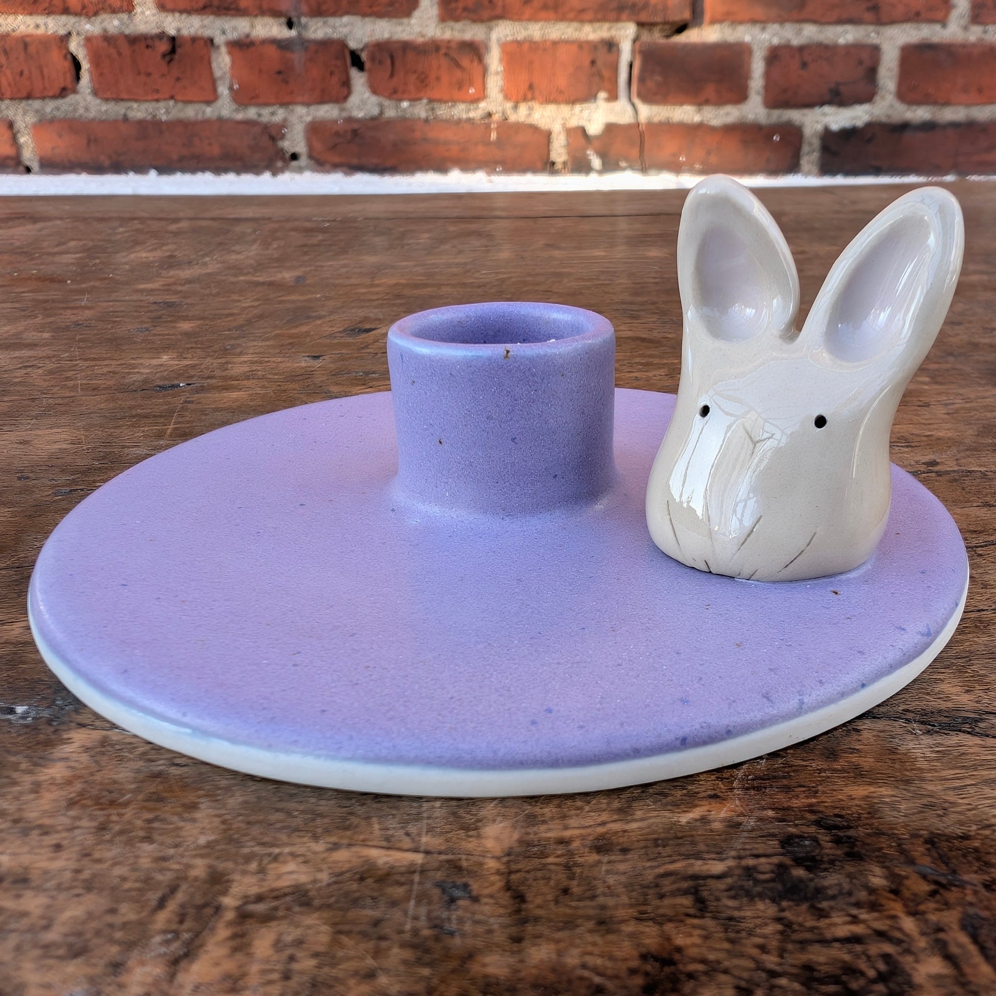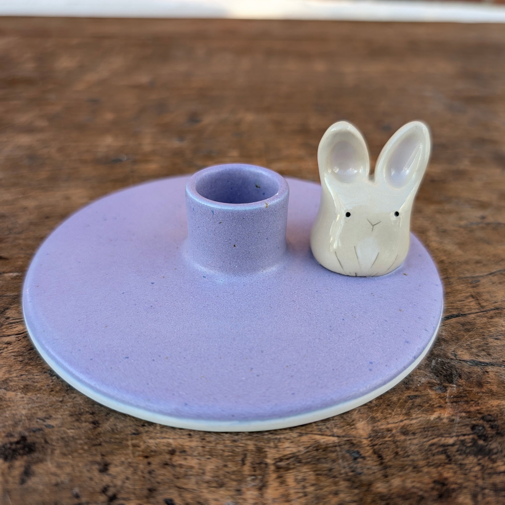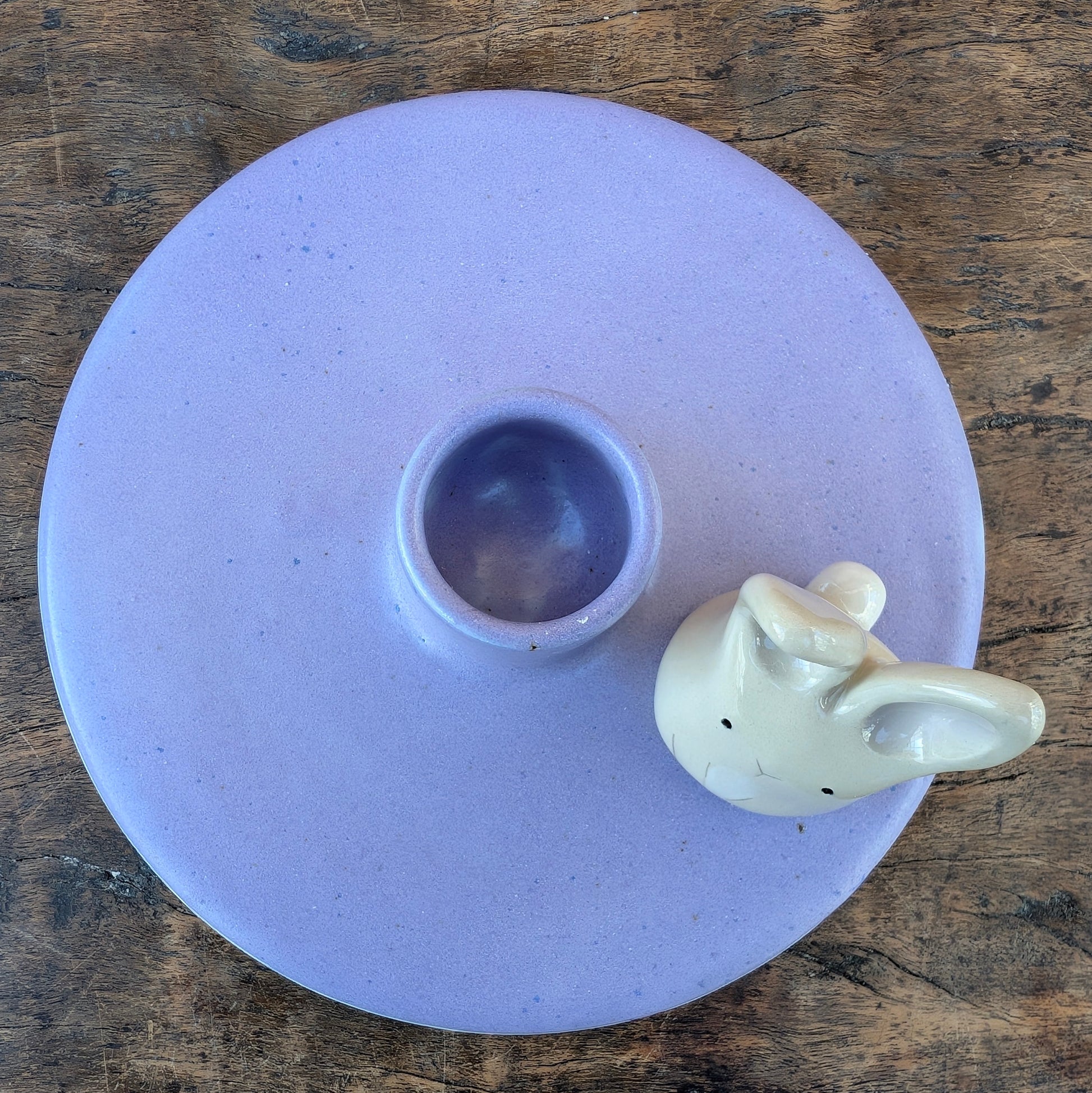 Skøn nistret lilla lysestage, med en sød lille påskehare.