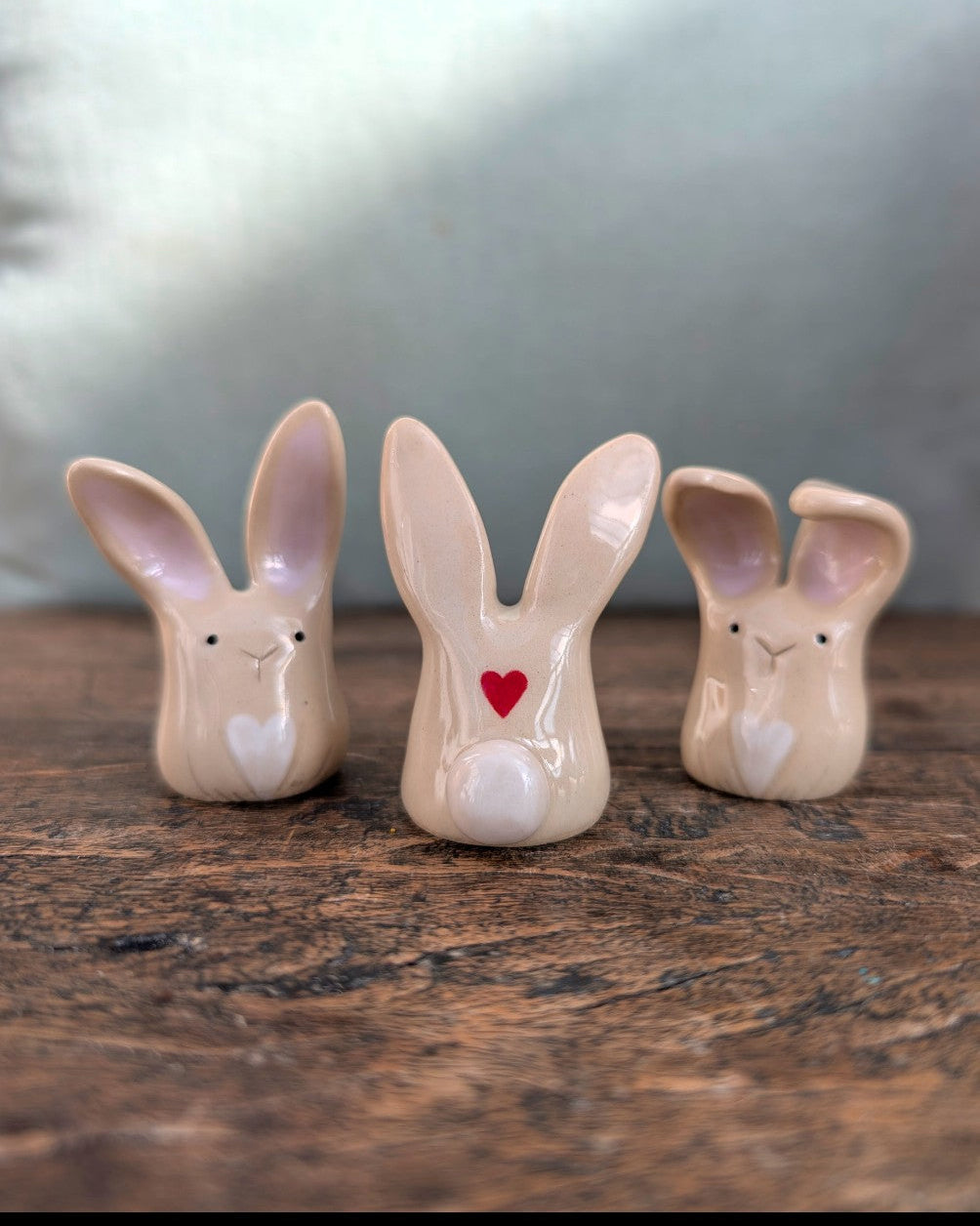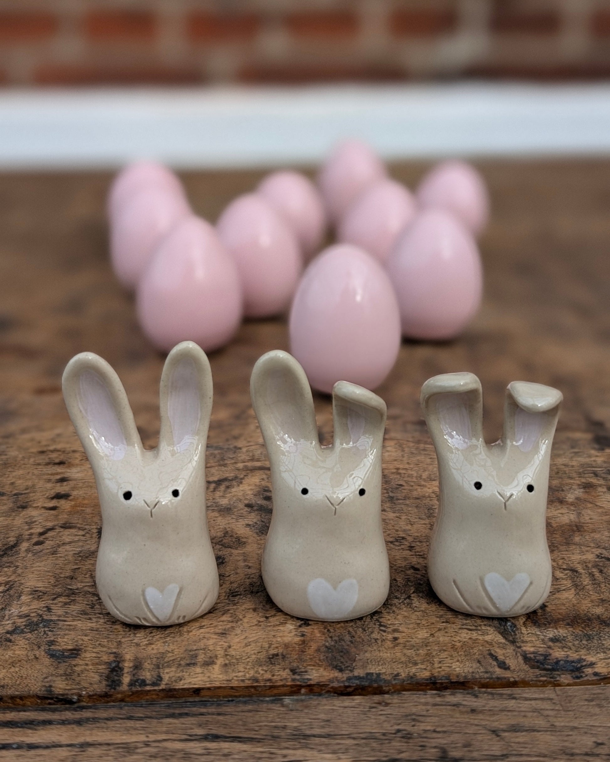 Finish: Blank transparent glasur. Sart lyserød i ørerne og hvide maver og haler