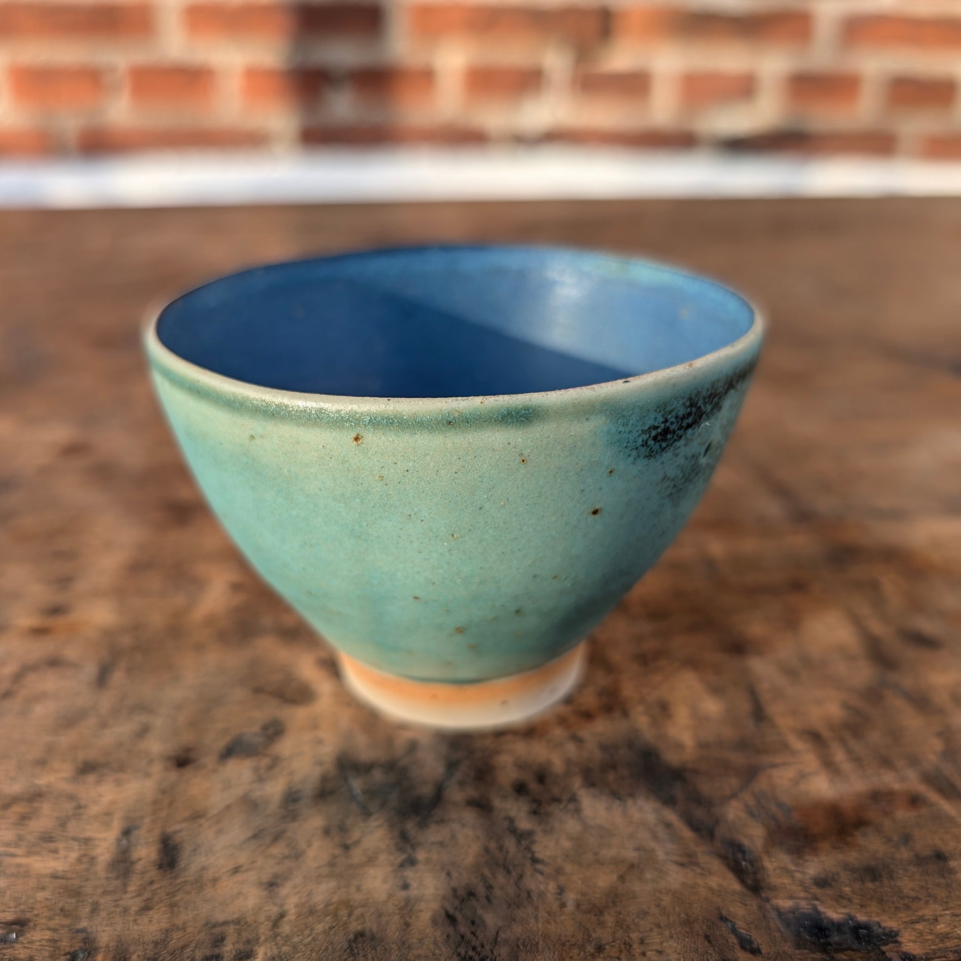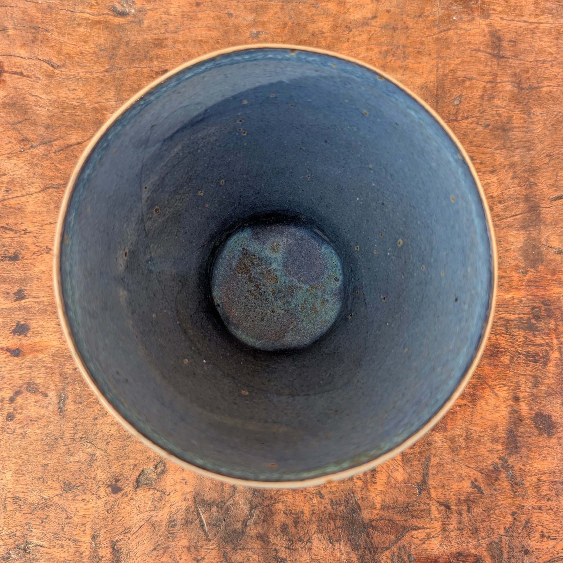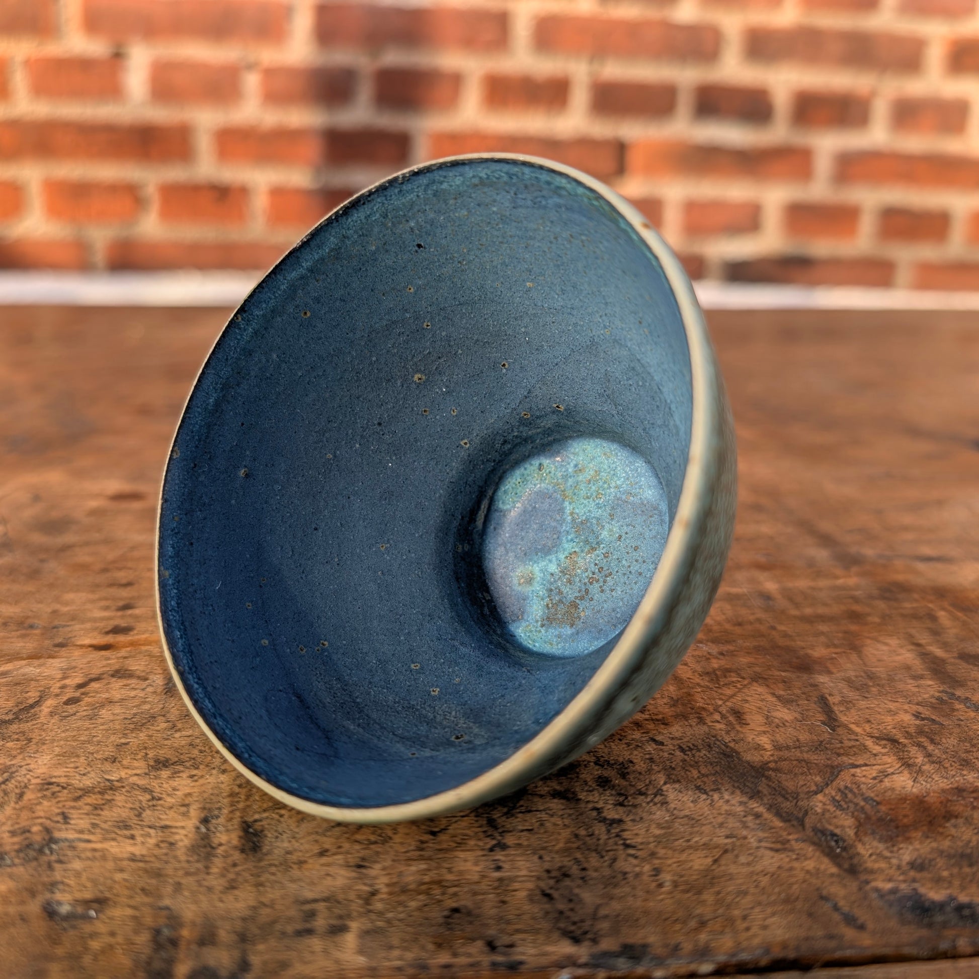Finish: Silkemat turkis glasur med sort melering og enkelte gennemslag af lerens lavapletter på ydersiden, helmat dybblå glasur på inderside
