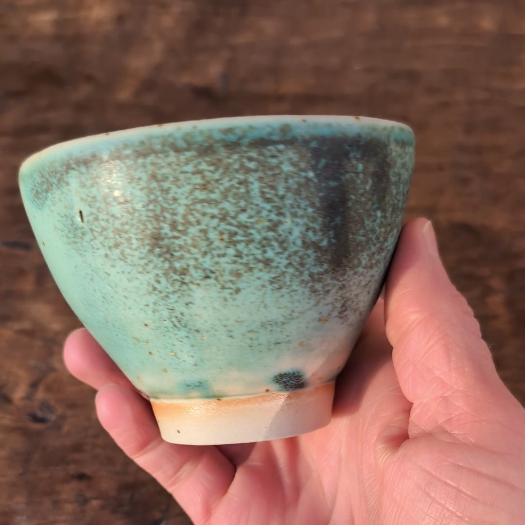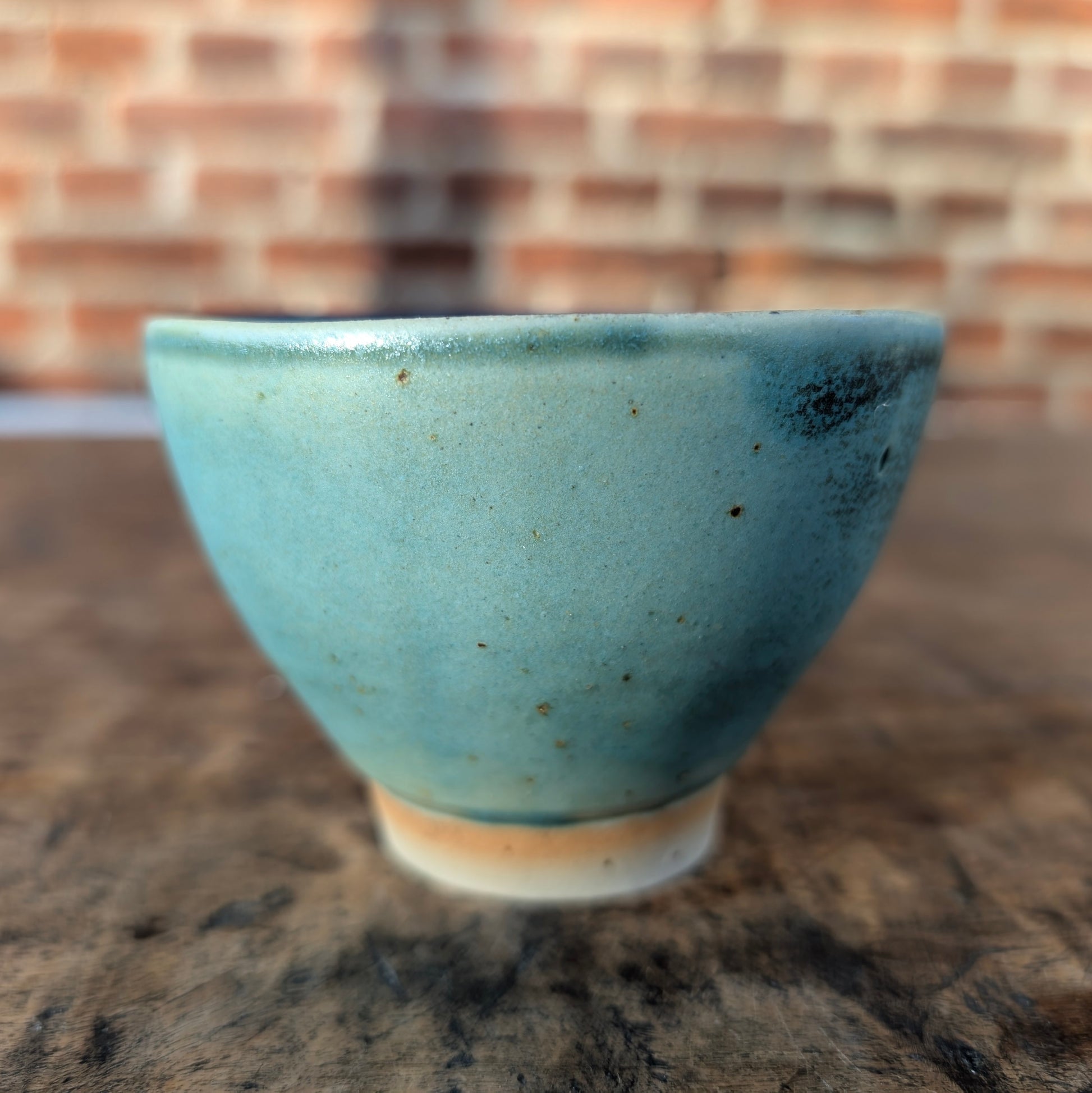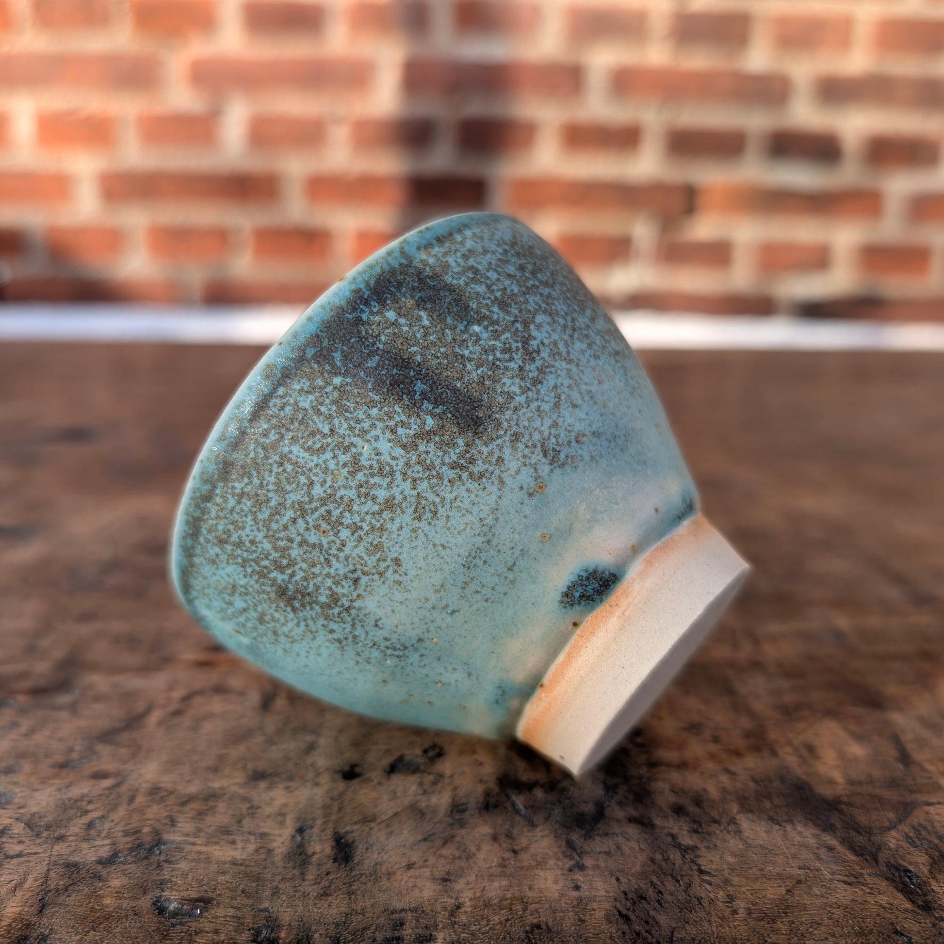 Finish: Silkemat turkis glasur med sort melering og enkelte gennemslag af lerens lavapletter på ydersiden, helmat dybblå glasur på inderside