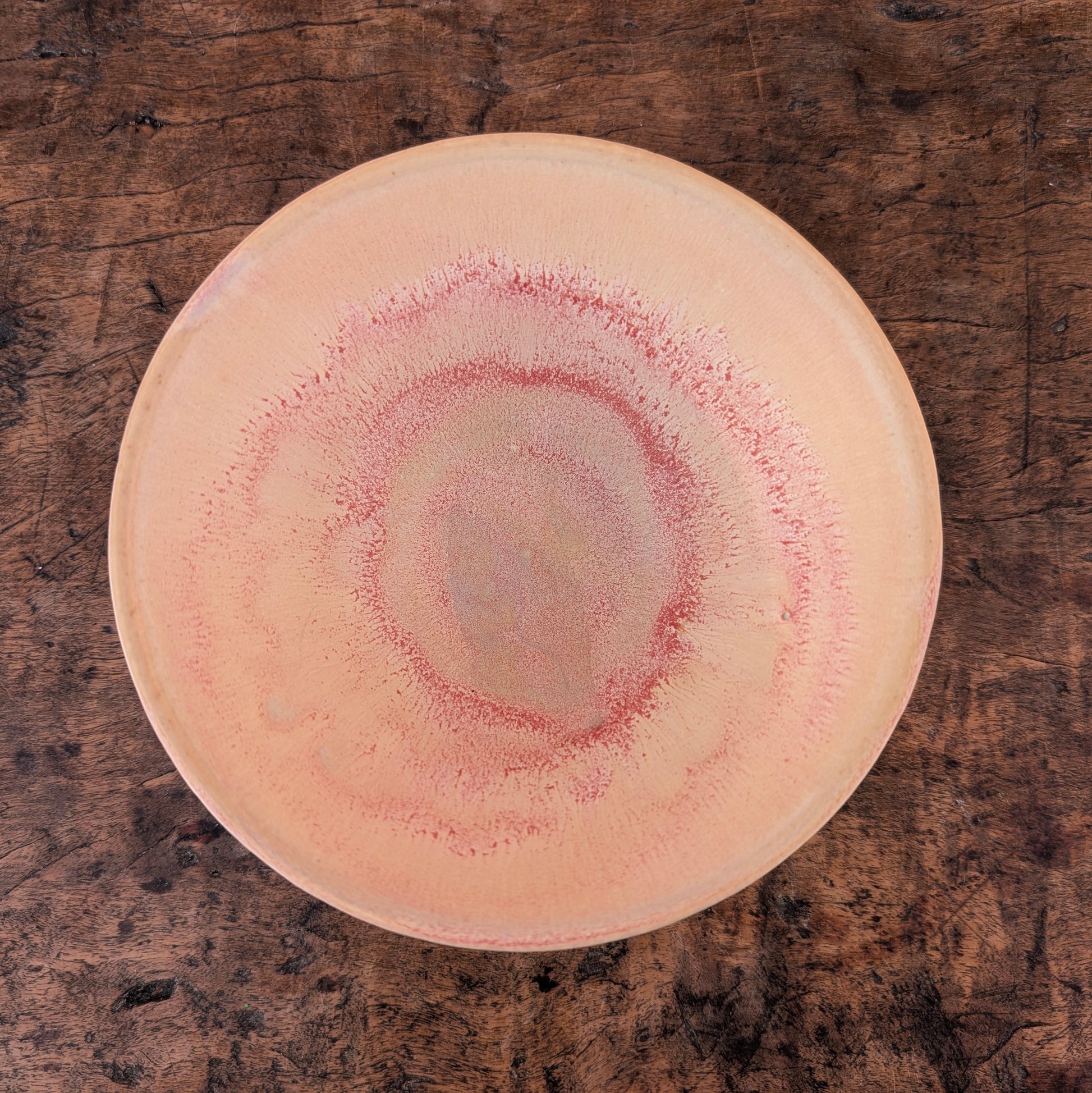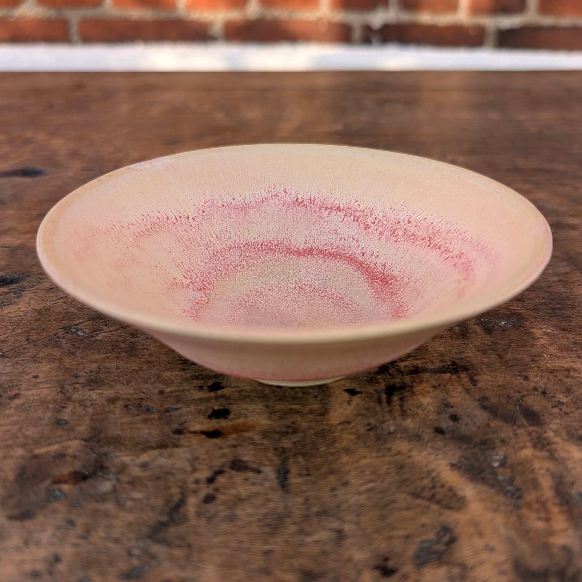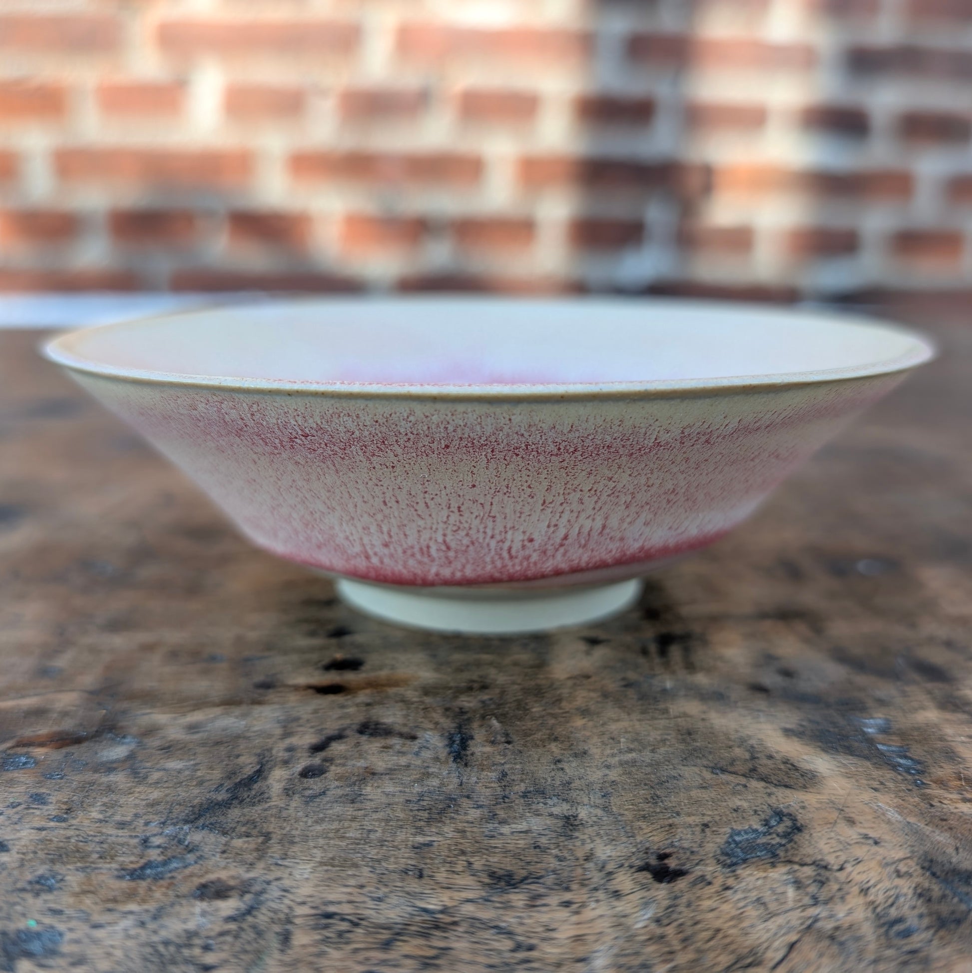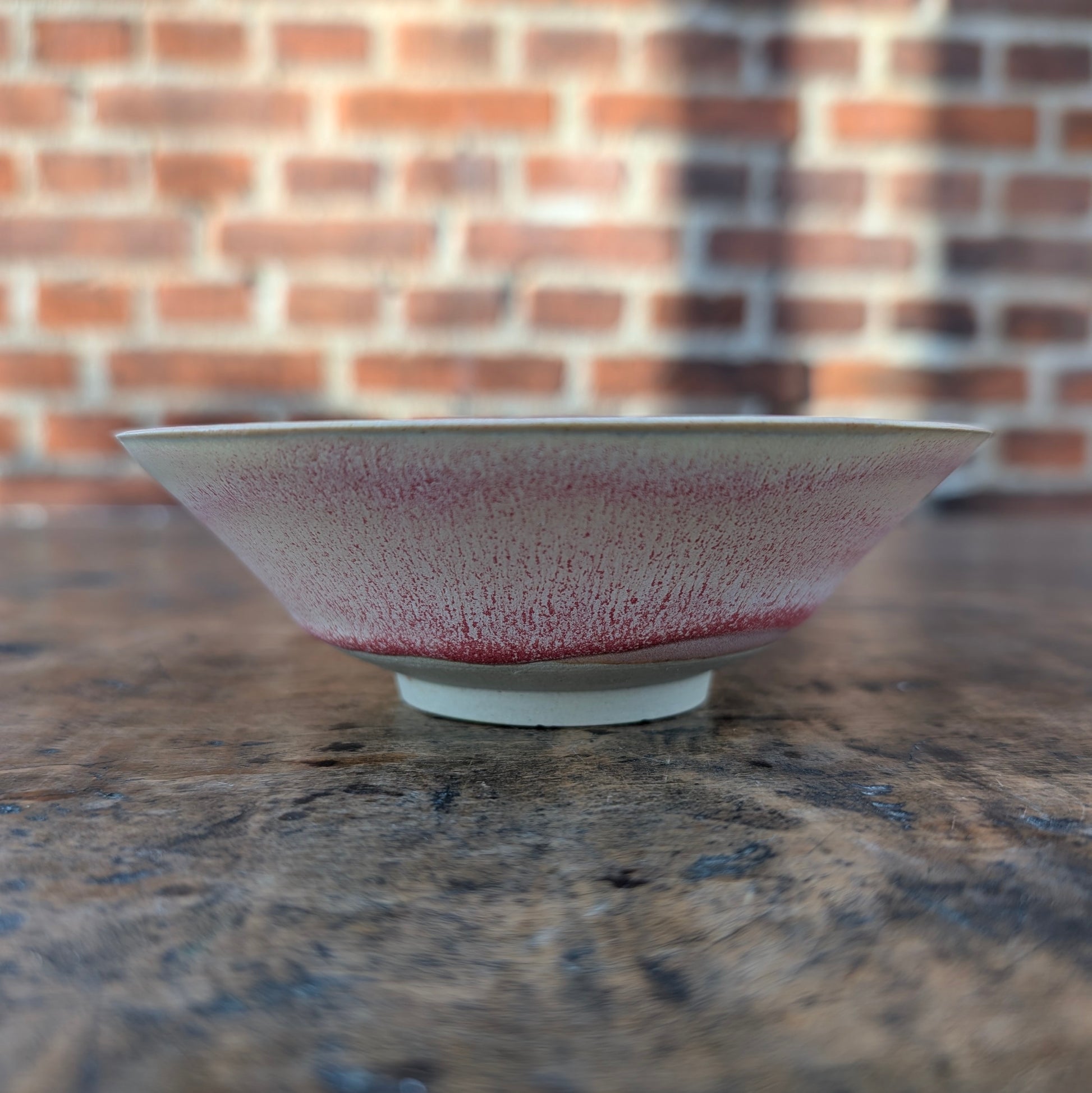 Sød skål i den skønneste lyserøde farve, hvor tankerne ledes hen på en lækker hindbæris. Skålen er drejet åben og flad, og har et meget dekorativt udtryk.