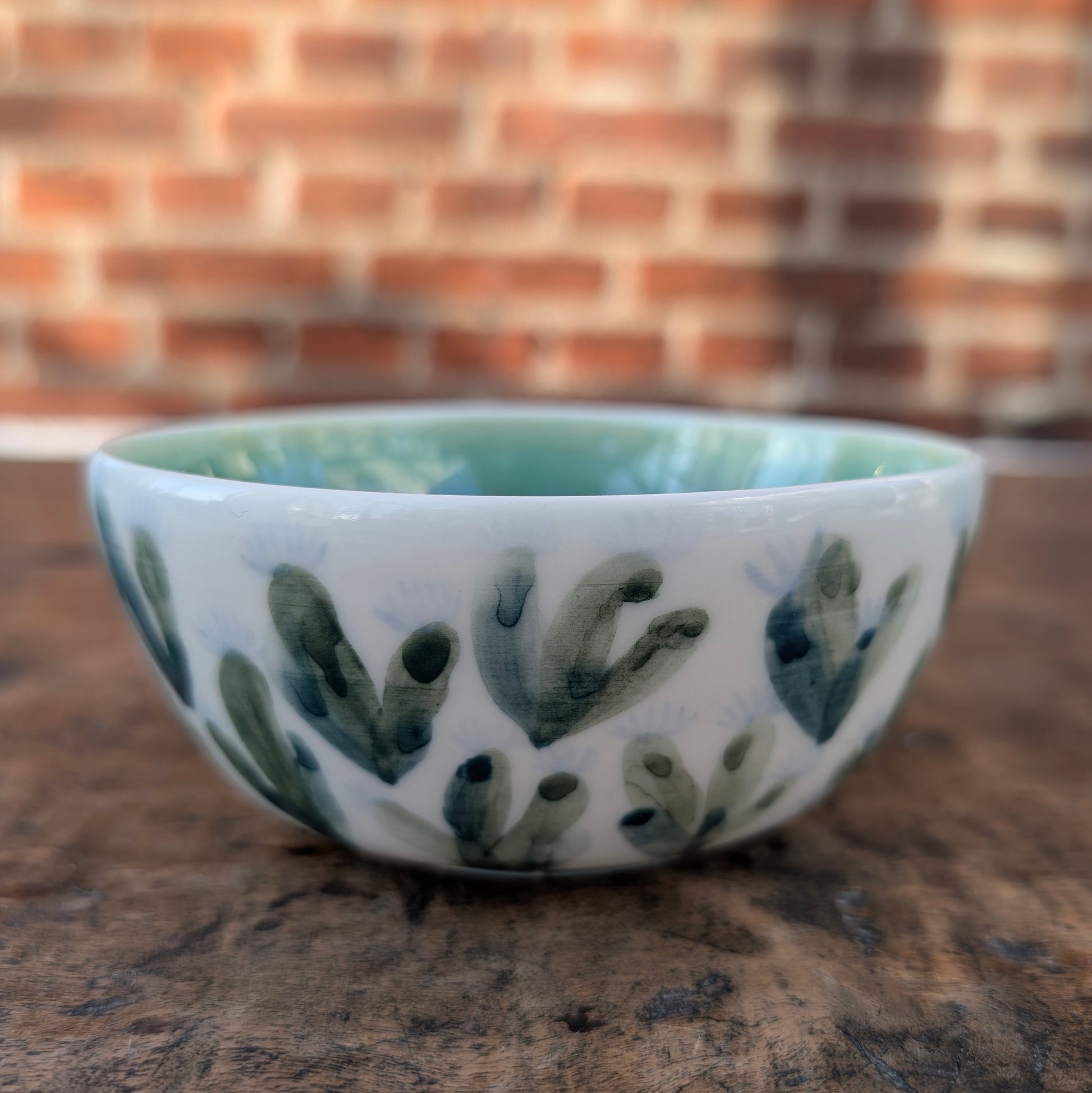 Smuk porcelænsskål på lav fod. Jeg har håndmalet ydersiden med keramiske akvareller, med sarte blå blomster og grønne frodige blade. Indersiden har et fantastisk flot spil, med turkis/grønne krystaller.