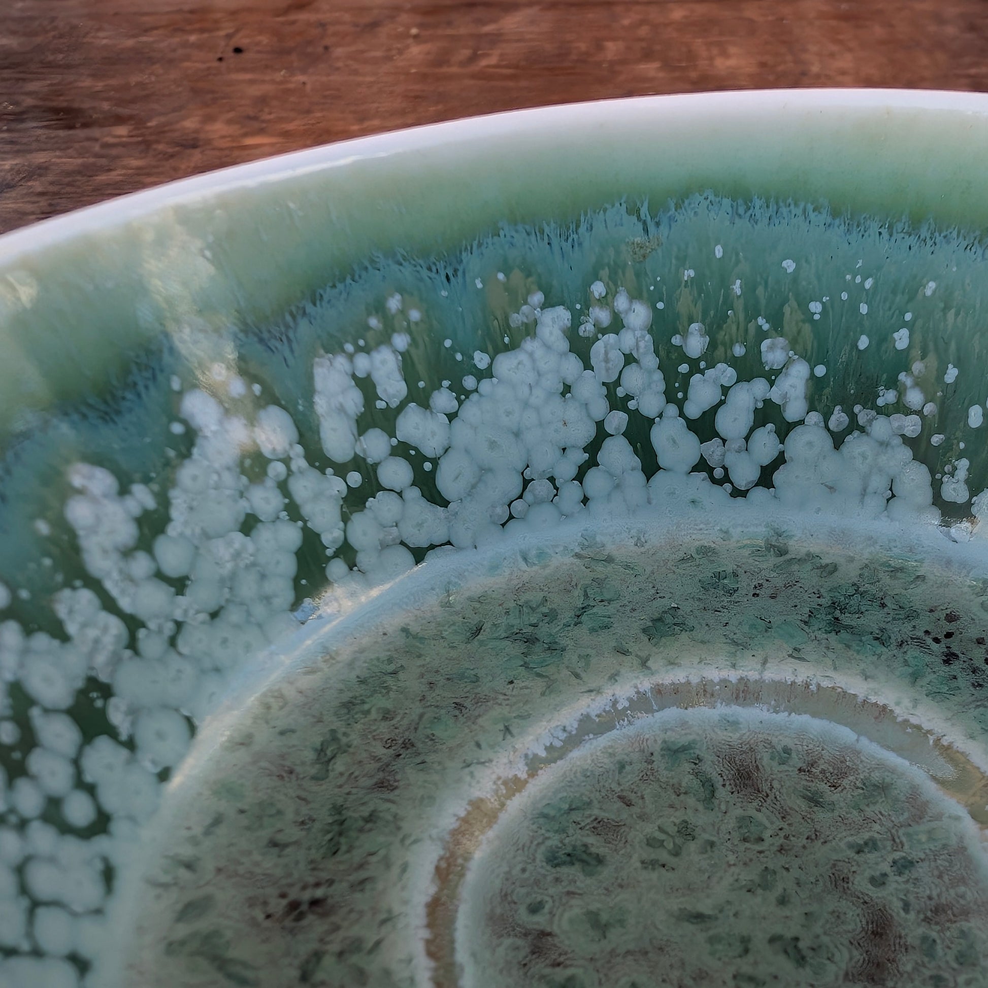 Finish: Blank transparent glasur med blå og grønne akvarelmotiver. Indersiden blank turkisgrøn glasur med krystaller