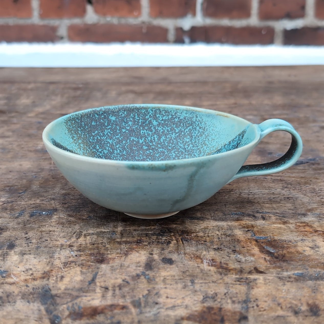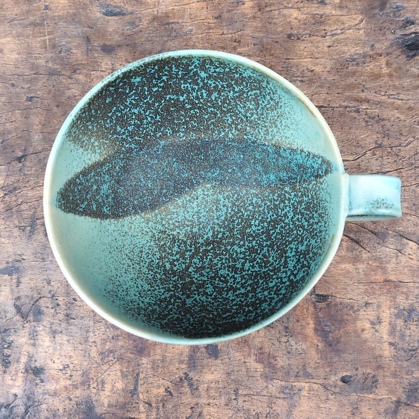 Skøn stor kop til din te eller café latte. Hanken er håndformet og sirligt påsat, så den smelter i ét med koppen. Nyd de smukke former og spillet i glasuren, når du drikker din kaffe af denne kop.