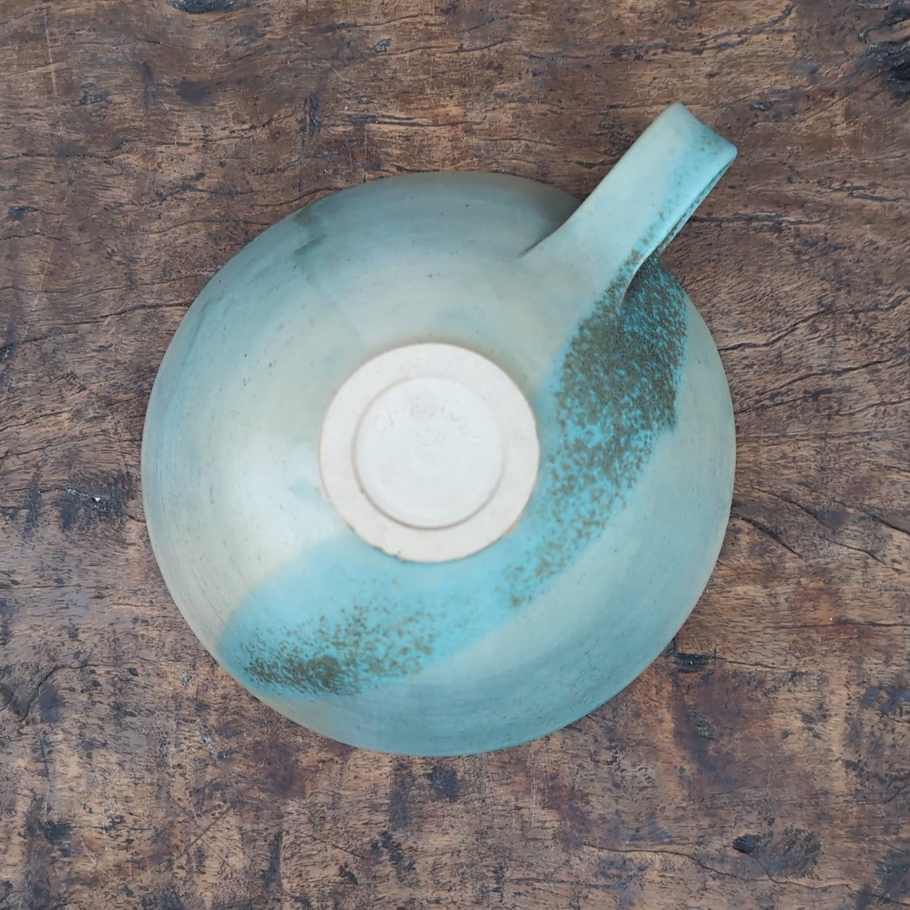 Finish: Grøn/turkis mat glasur med mørkt spil der varierer på overfladen fra yderside til inderside